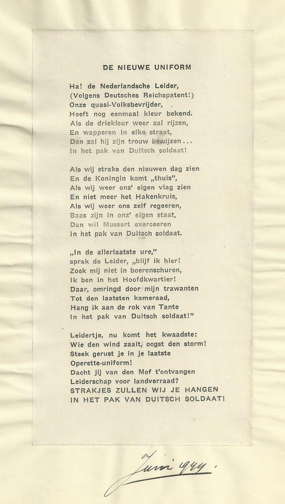 vel met tekst van het gedicht "De nieuwe uniform".
