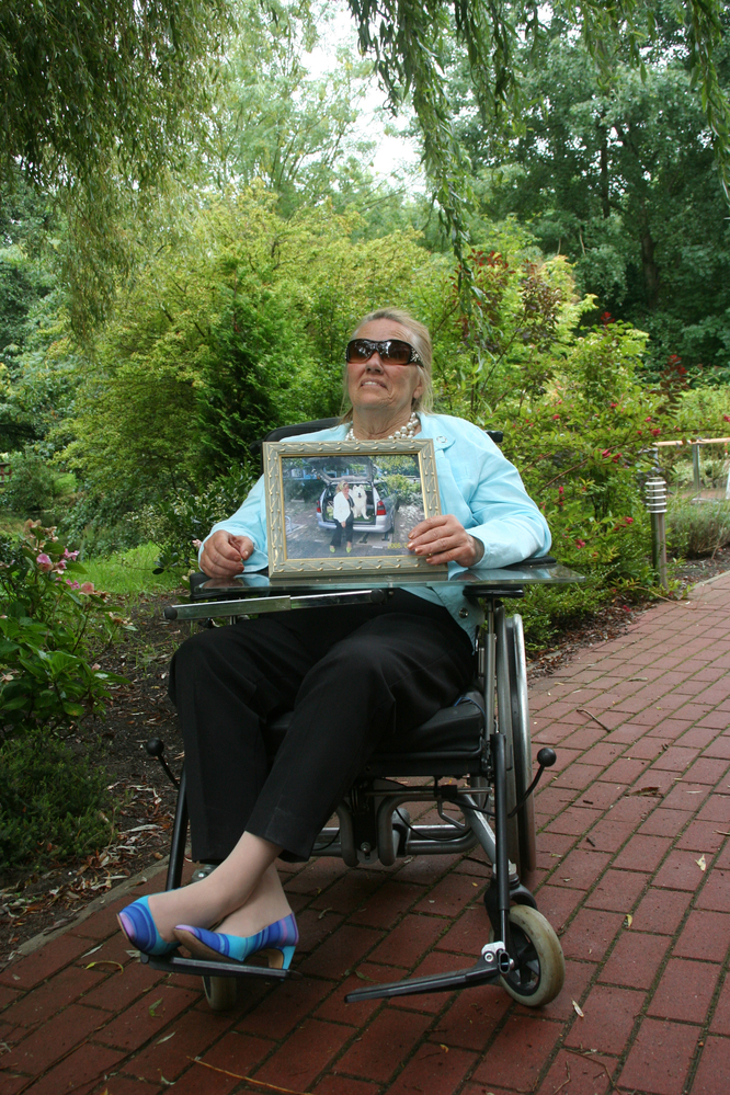 Het topstuk (foto van de auto met haar hond) van mev...