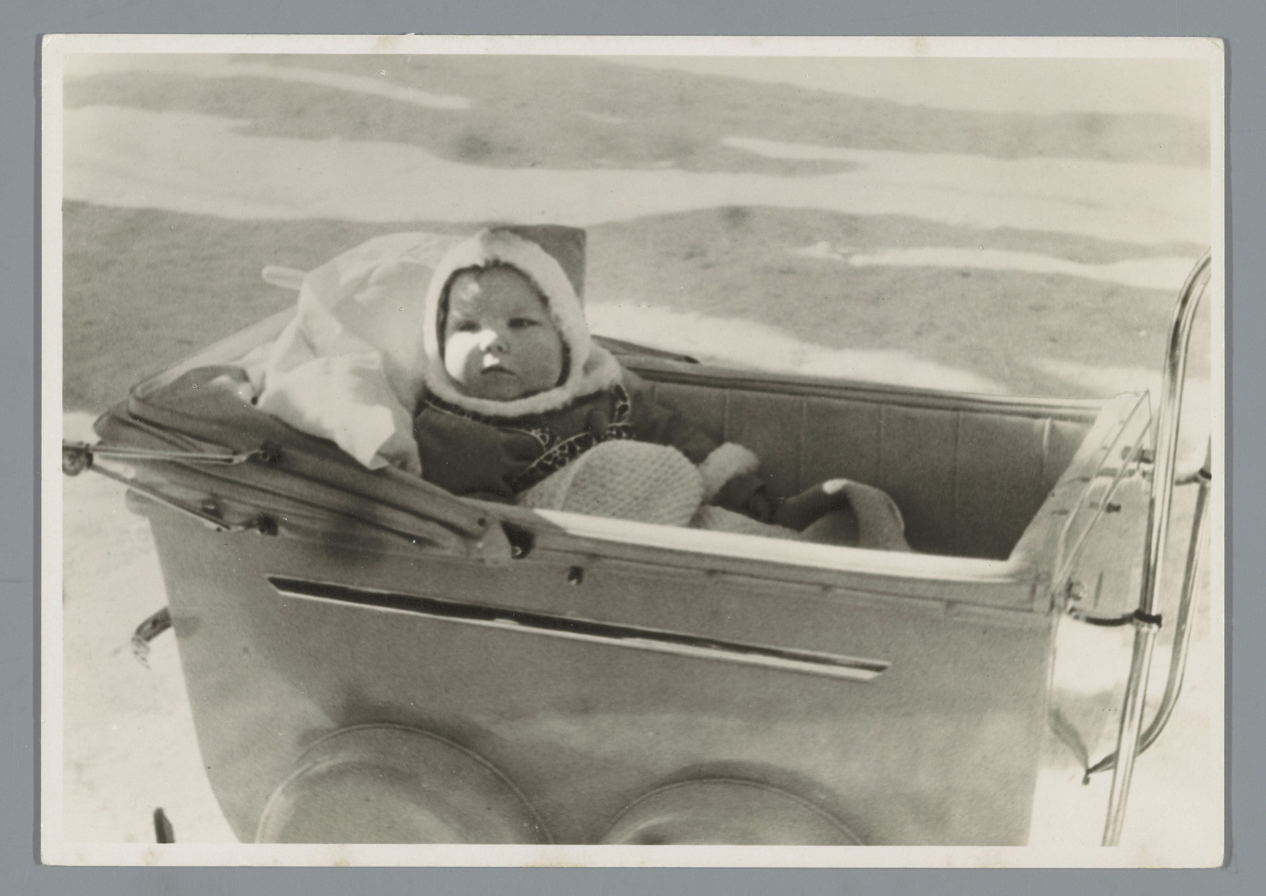 Prinses Beatrix in een kinderwagen tijdens de winter...