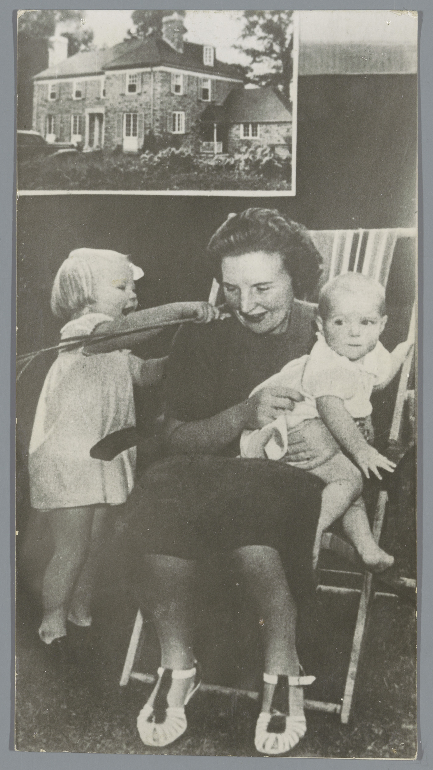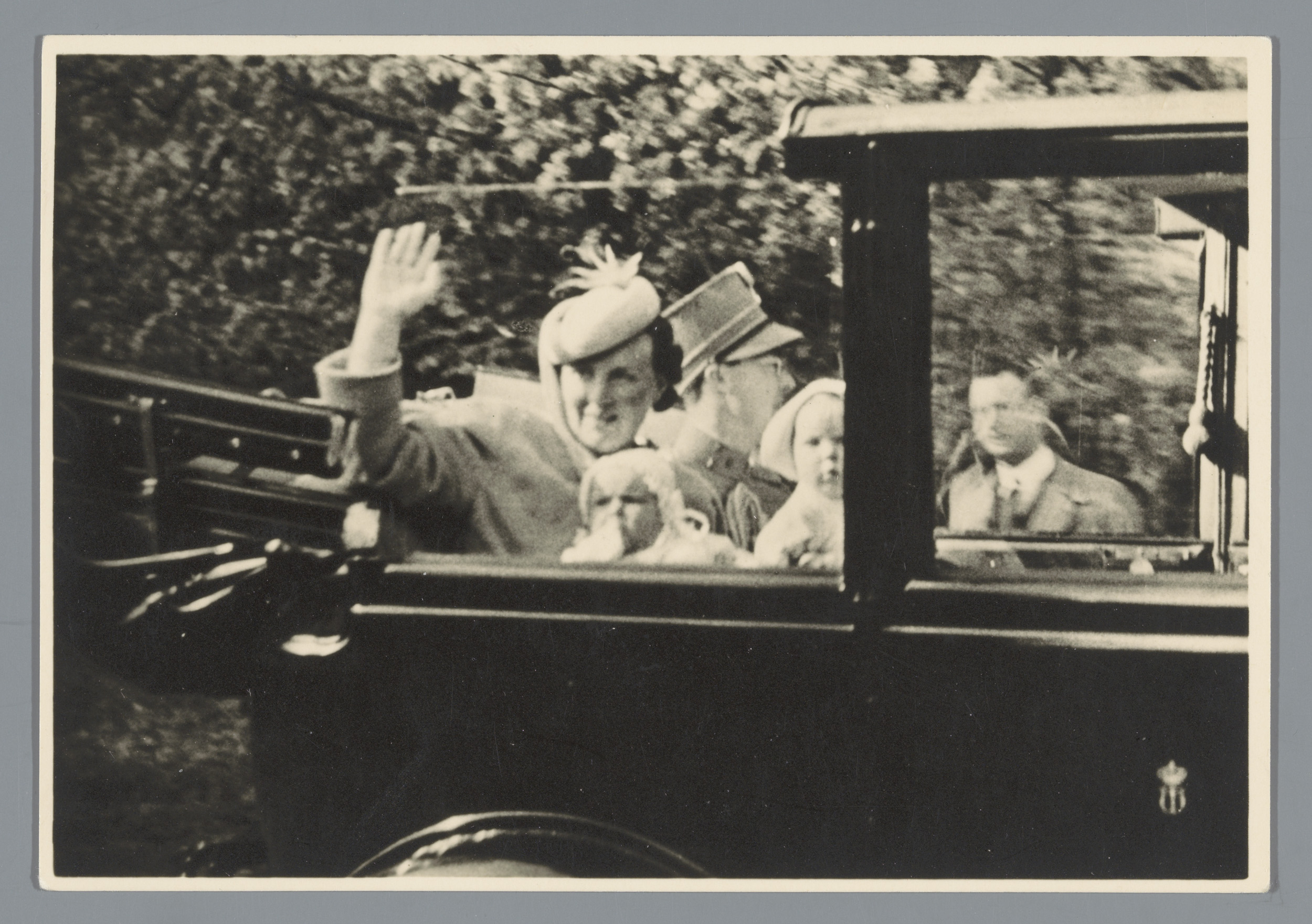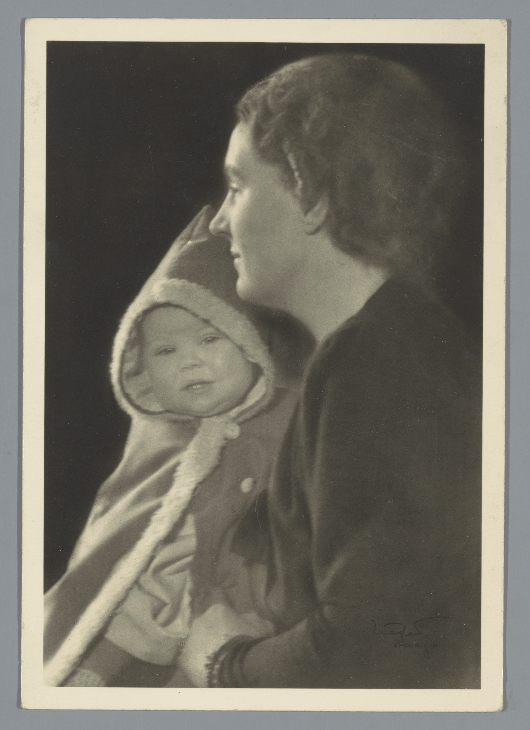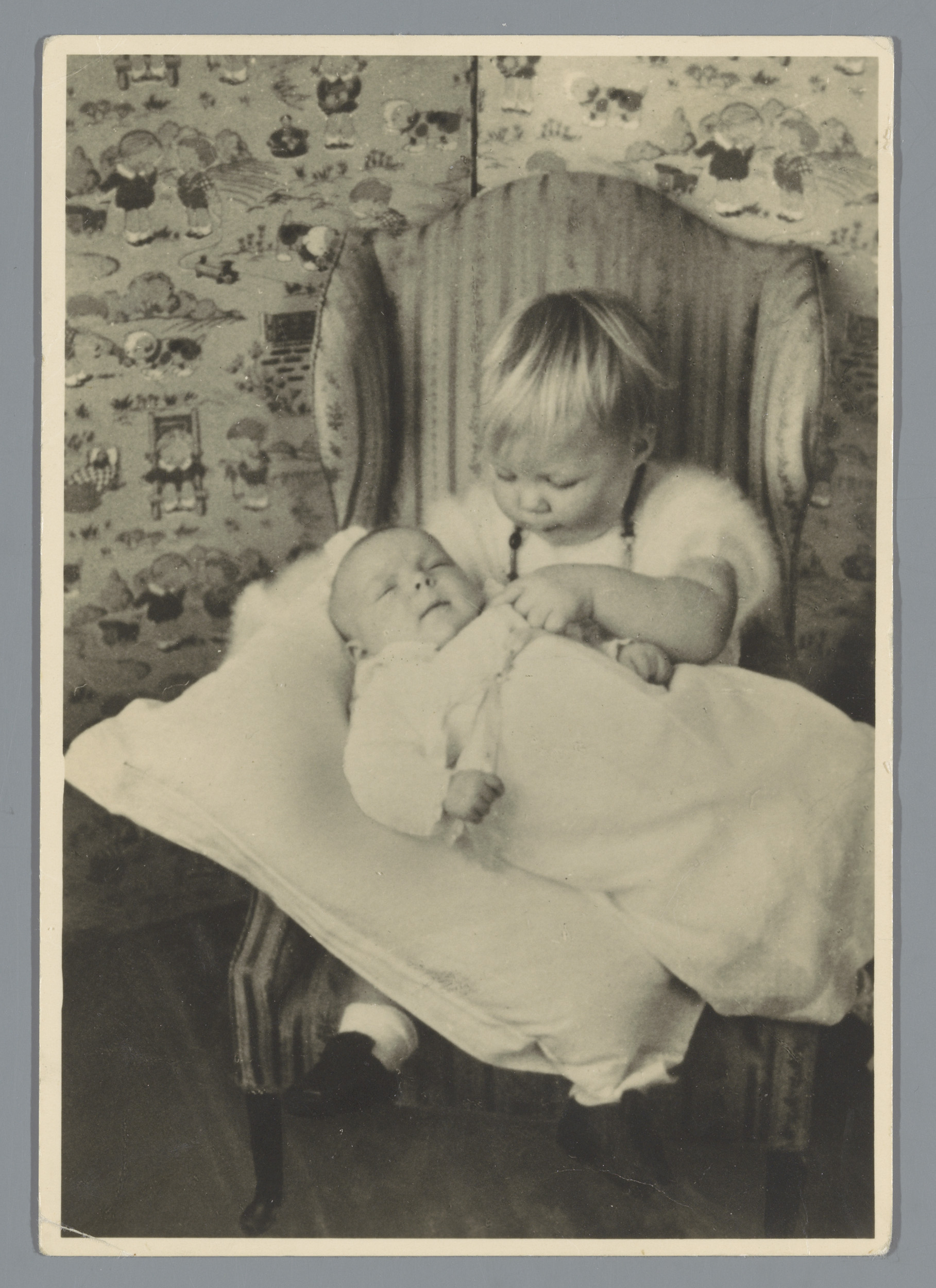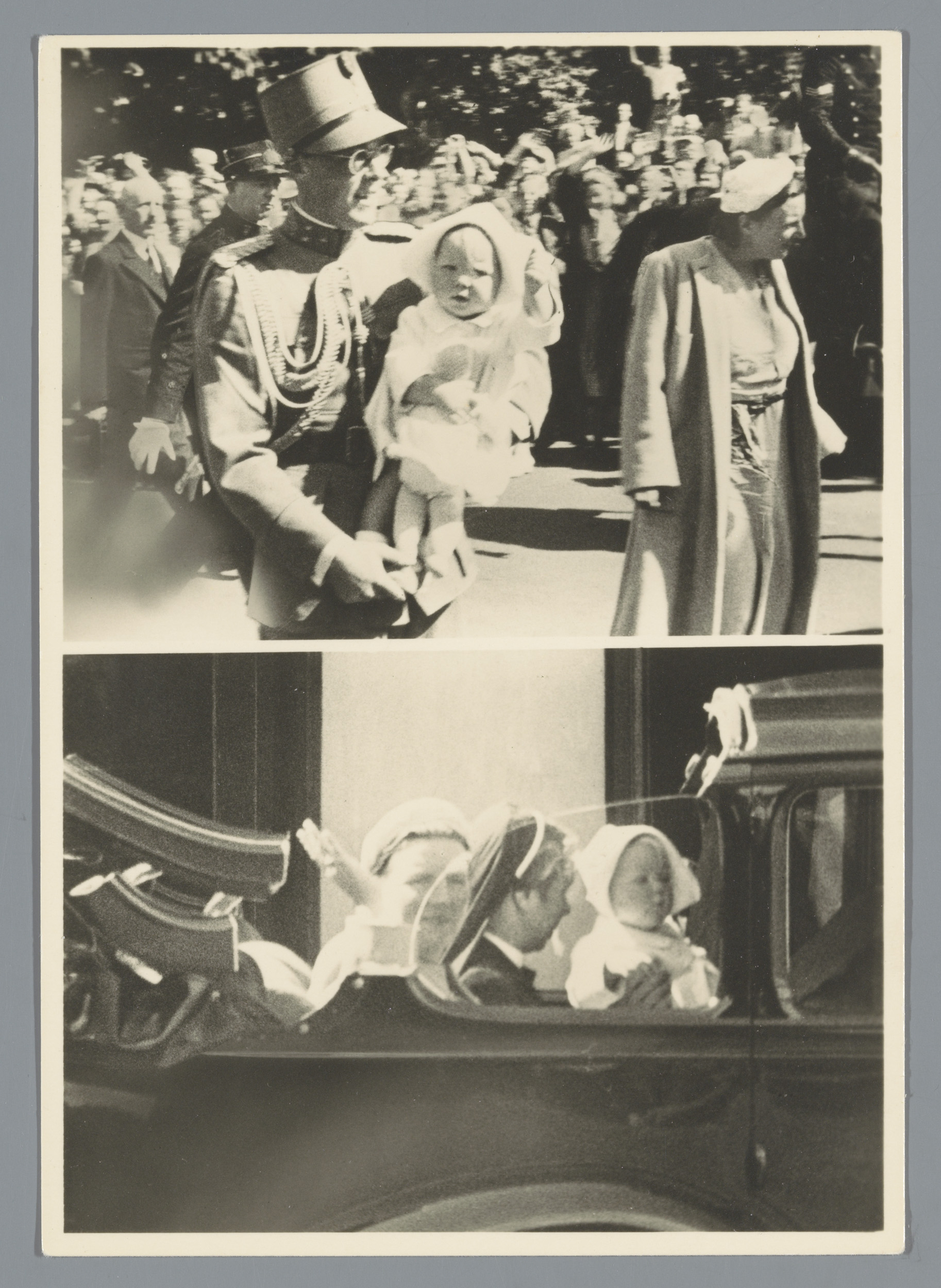 Prins Bernhard draagt Beatrix op de arm en de konink...