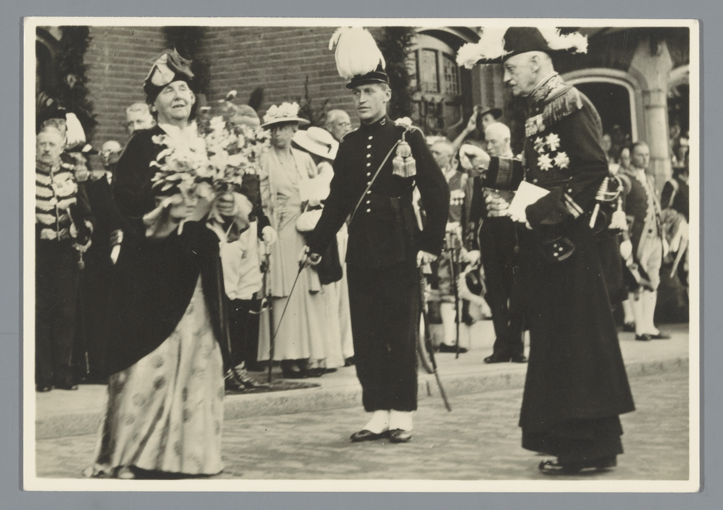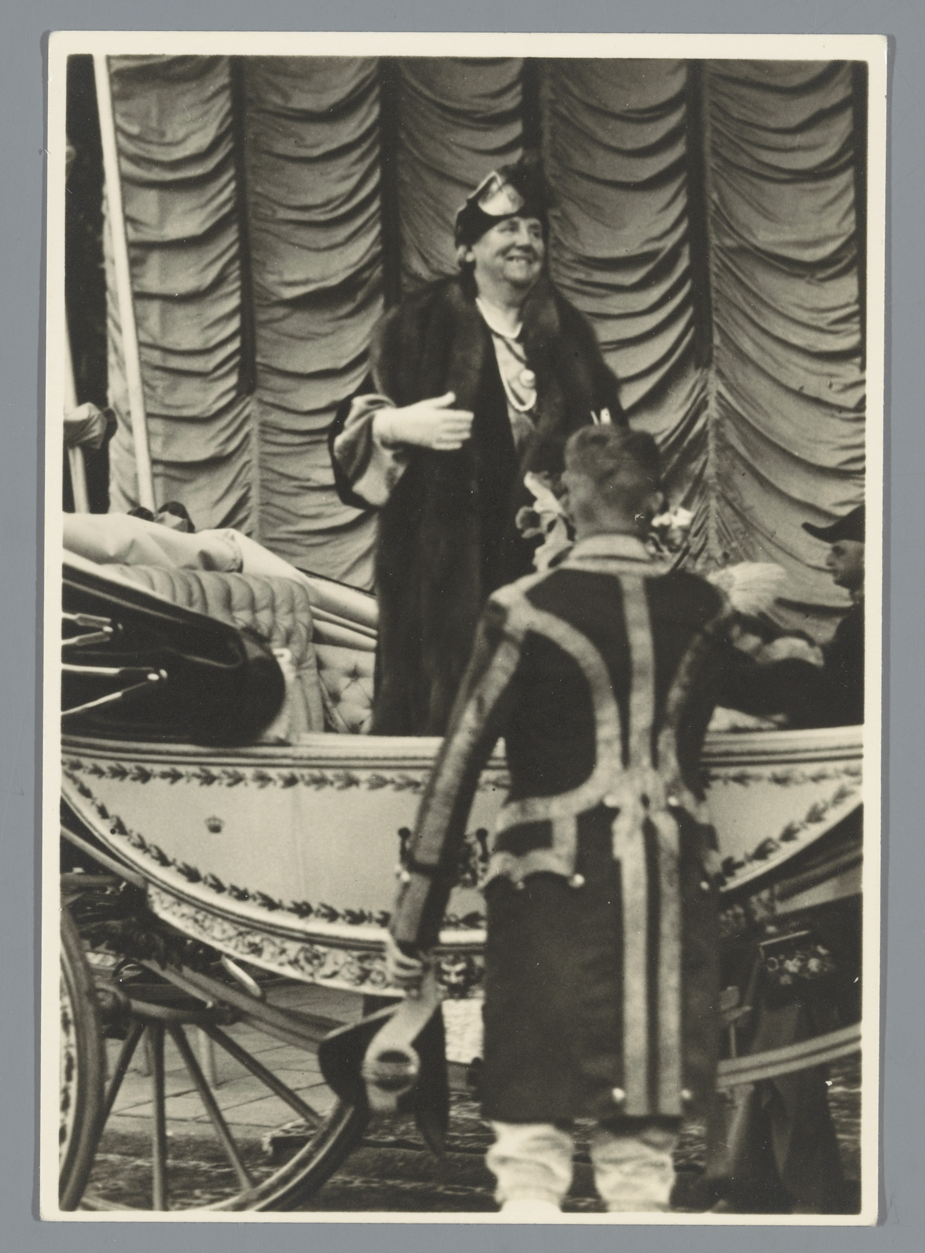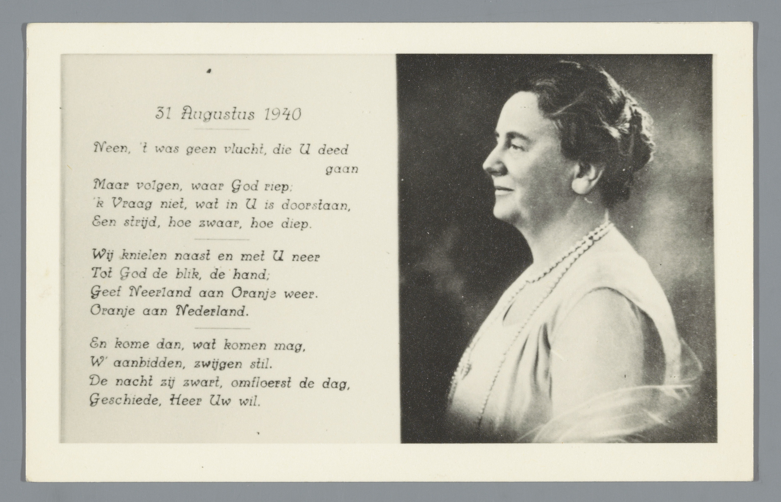 Portret van koningin Wilhelmina, met daarnaast een g...