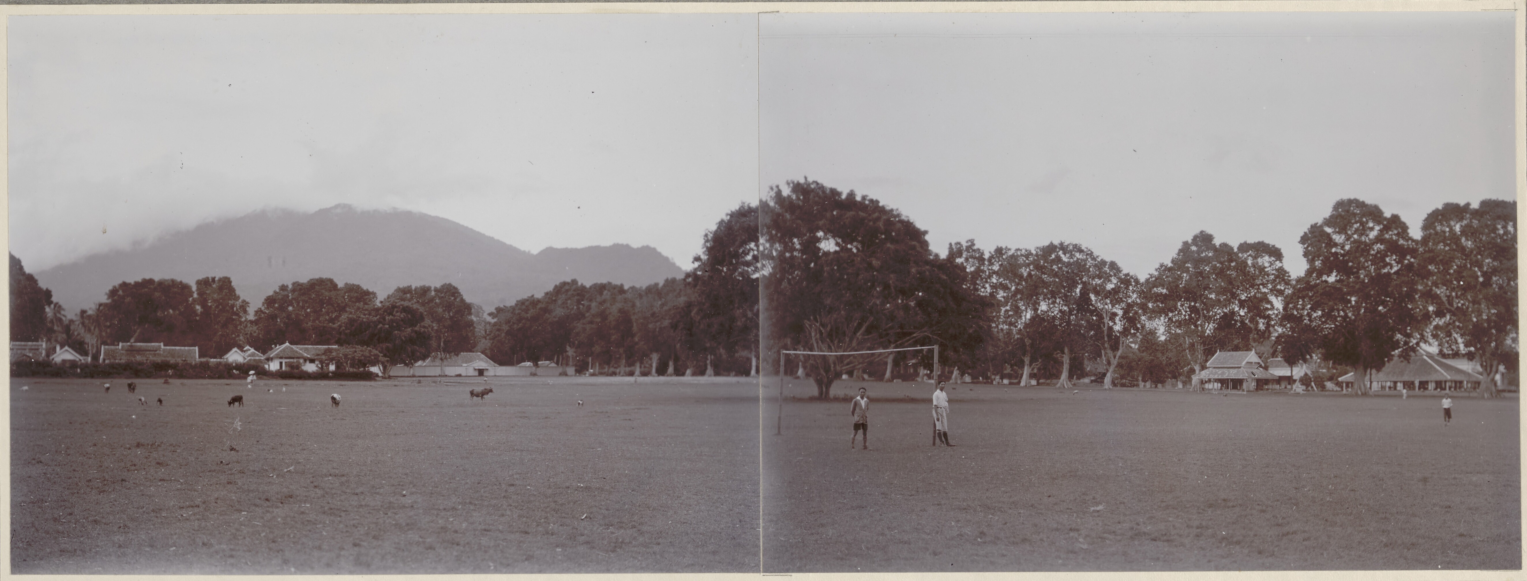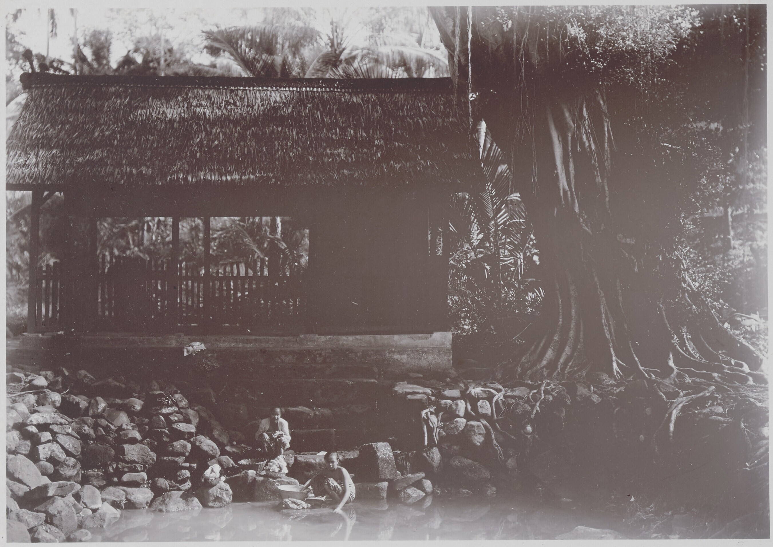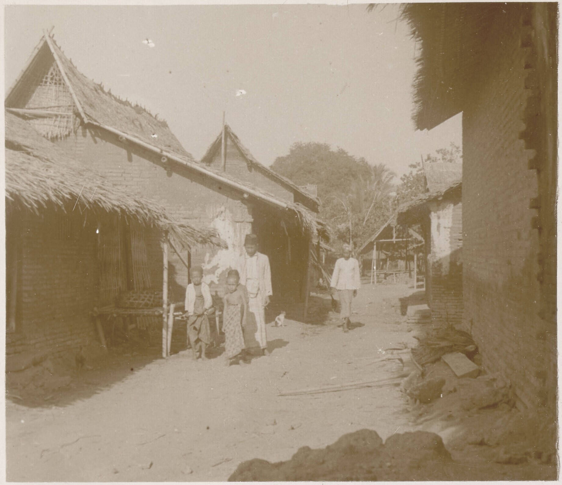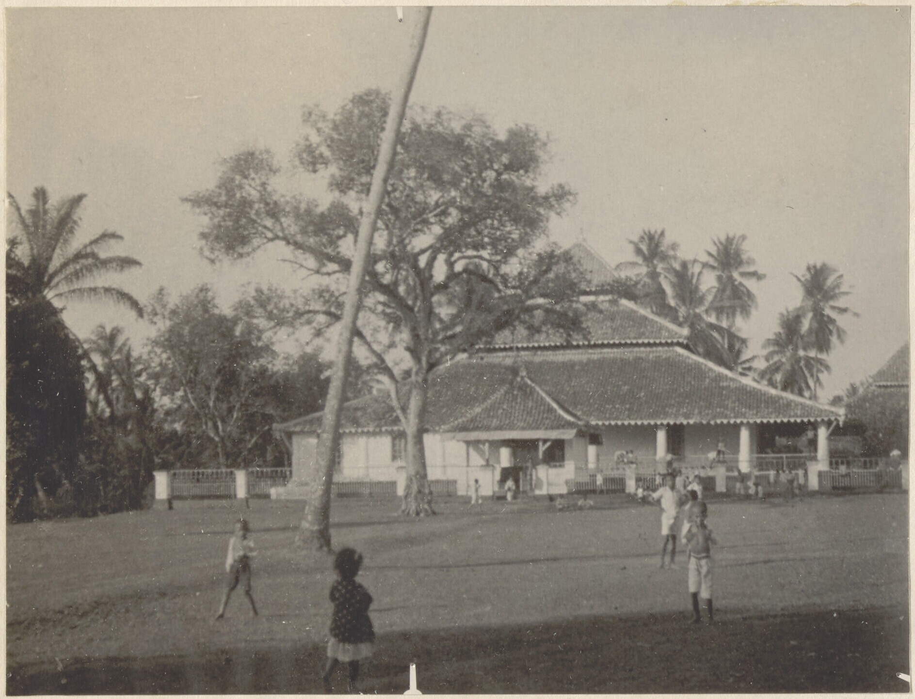 Prauwen en zwemmende kinderen in de haven van Tjiloerah