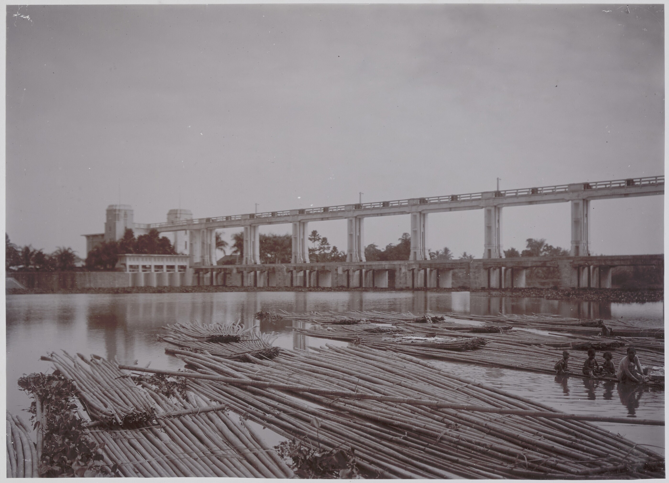 Bamboevlotten naast de stuw in de rivier Ciujung bij...
