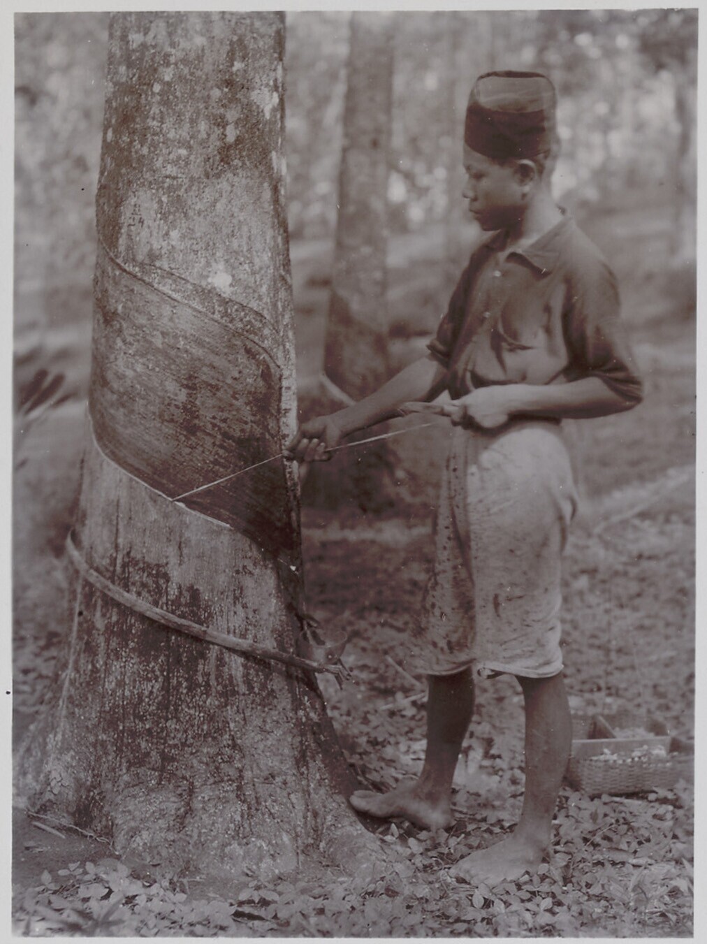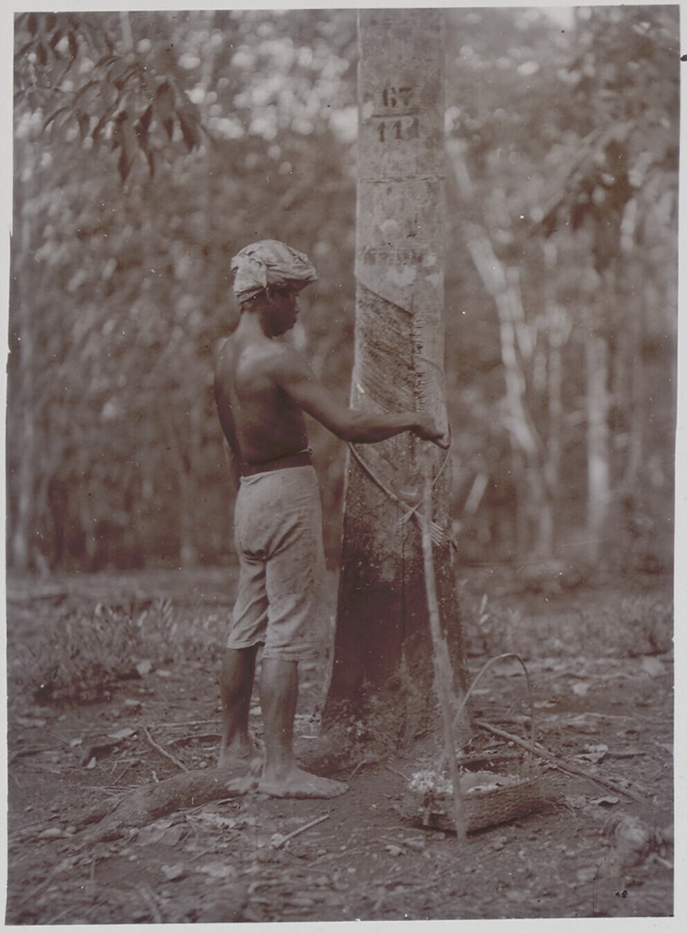Gathering scraps after tapping a rubber tree