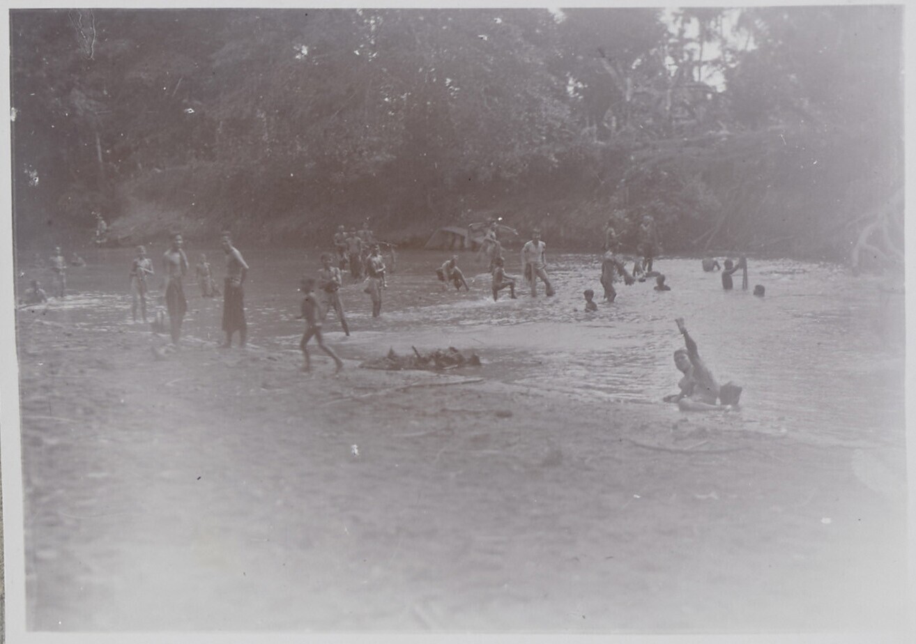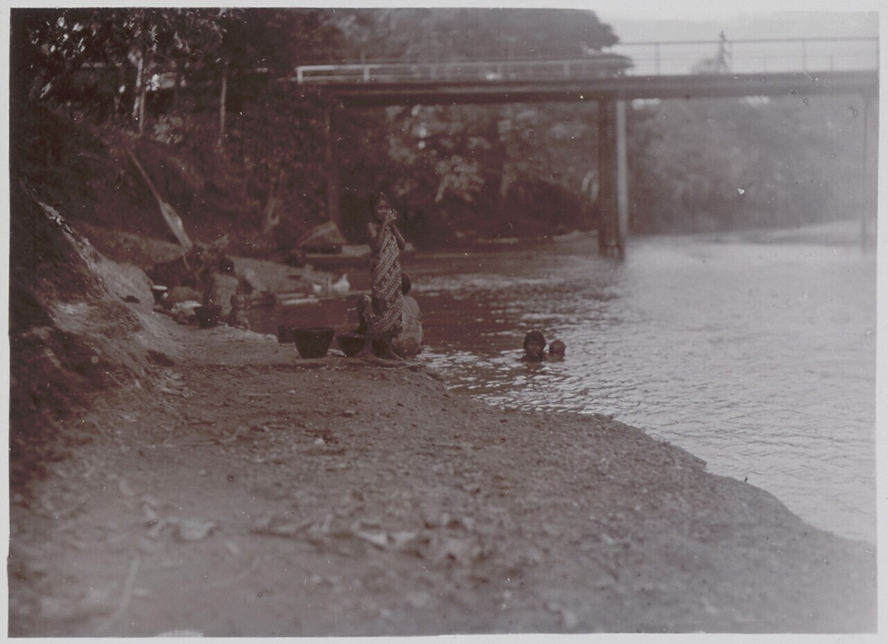 Women and children bathing and washing clothes in th...
