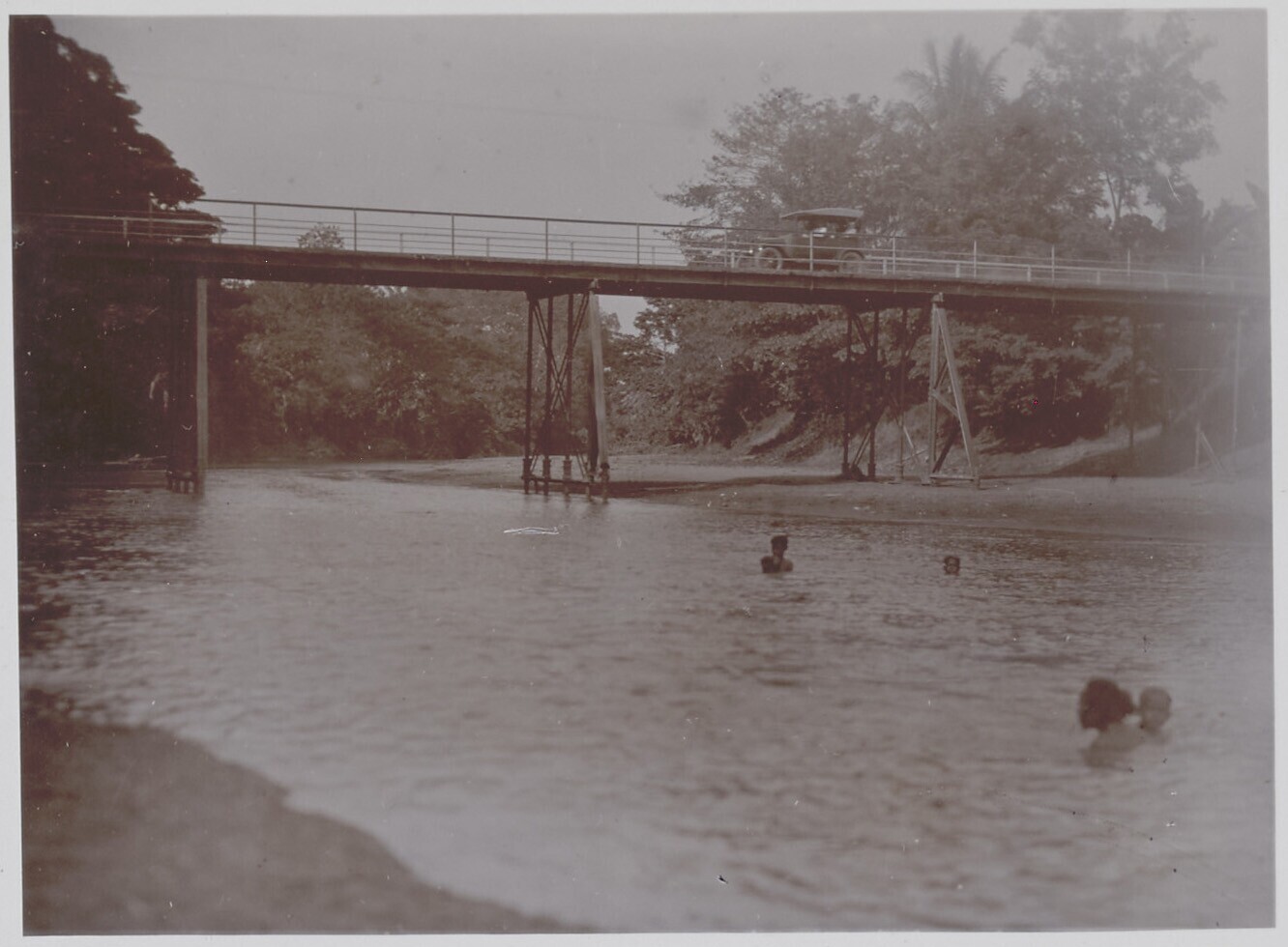 Auto passeert een brug over de rivier Cidurian