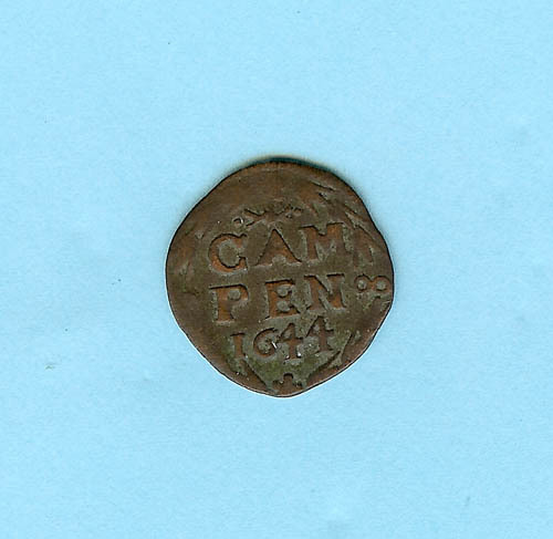 Duit van Kampen met gekroonde stadspoort met drie to...