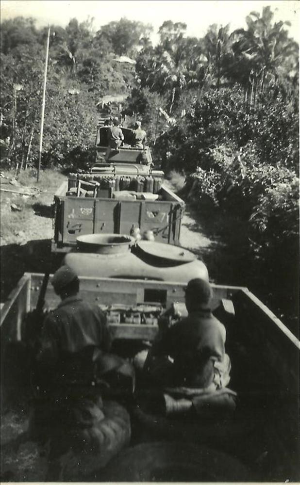 Nederlands Indië; konvooi, militair voertuig, struik...