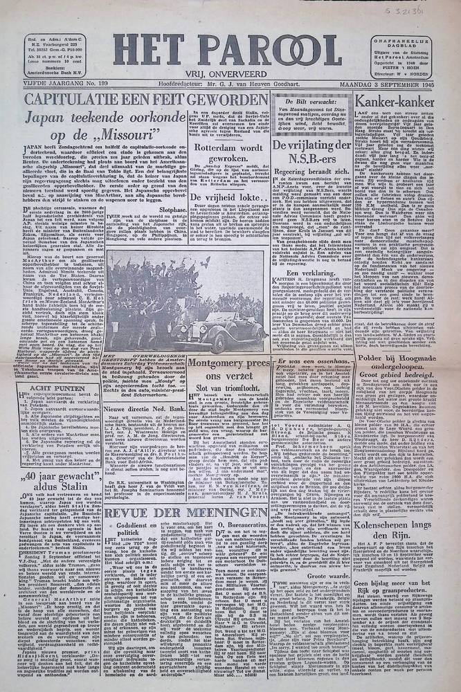 Het Parool, 3 september 1945, 5e Jaargang, No 199
