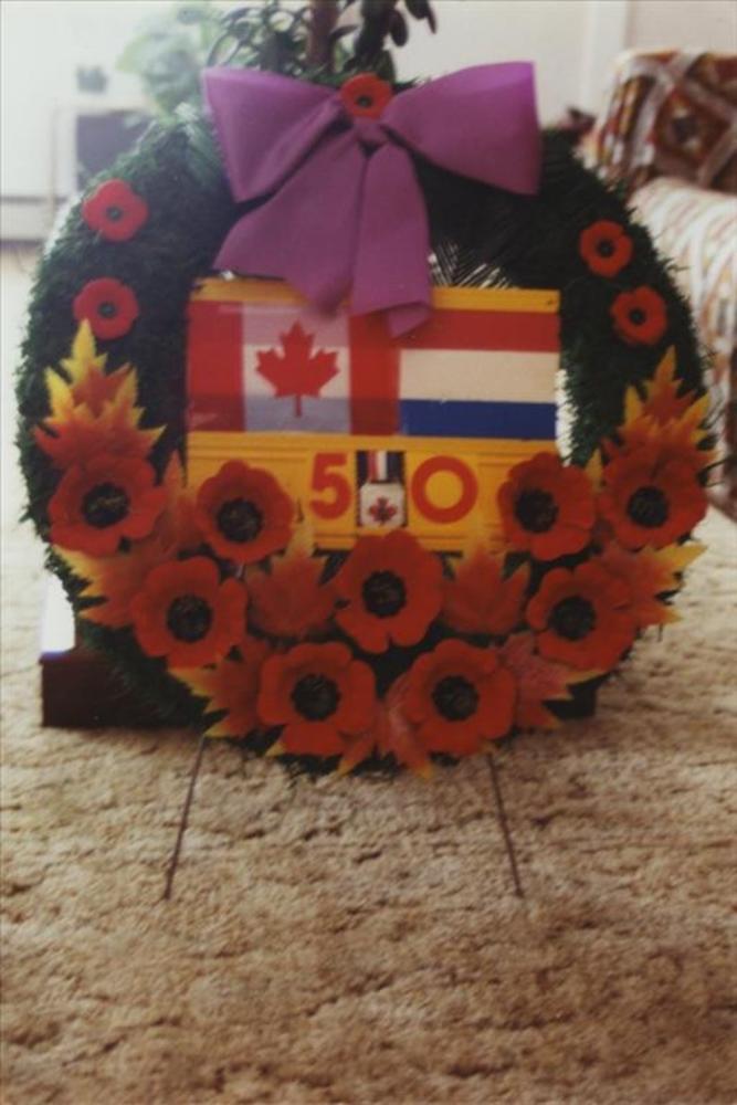 krans met Canadese en Nederlandse vlag met jaartal 50