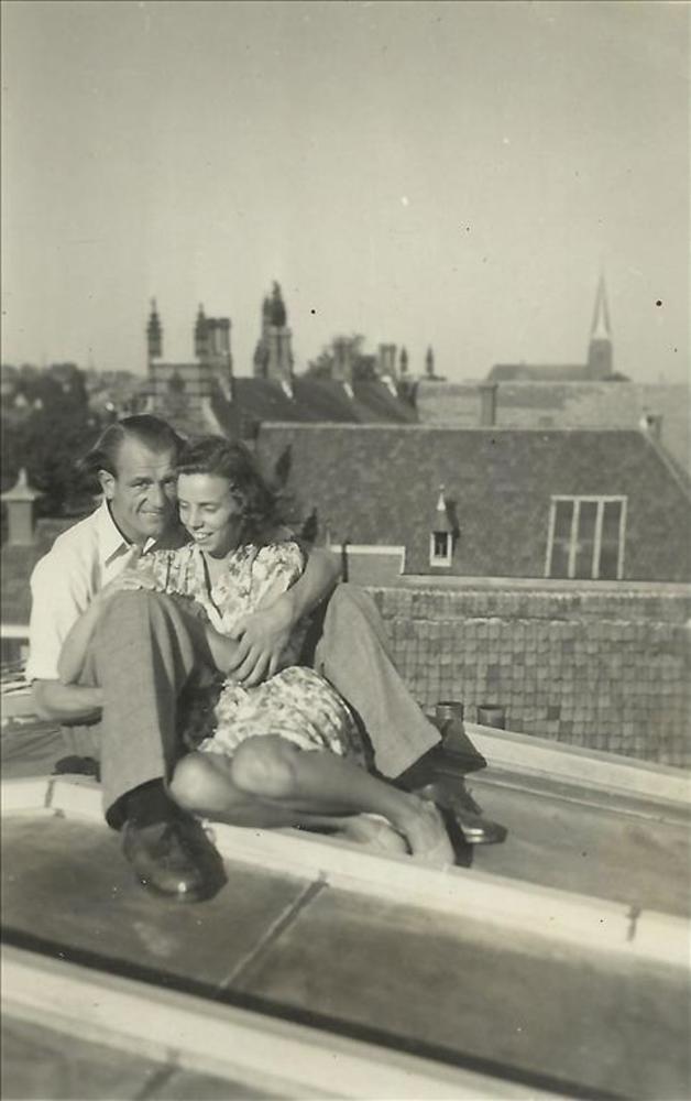 jonge man en jonge vrouw op het dak met stad op acht...