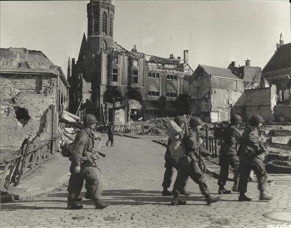Amerikaanse parachutisten in centrum Nijmegen