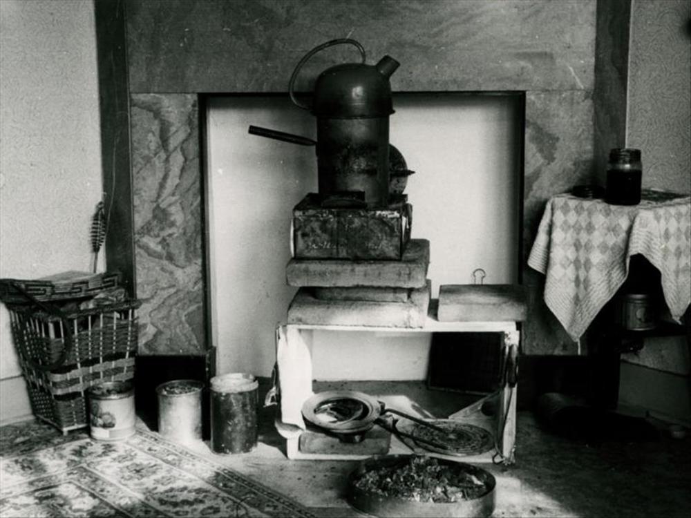 huiskamer interieur met noodkachel en benodigdheden