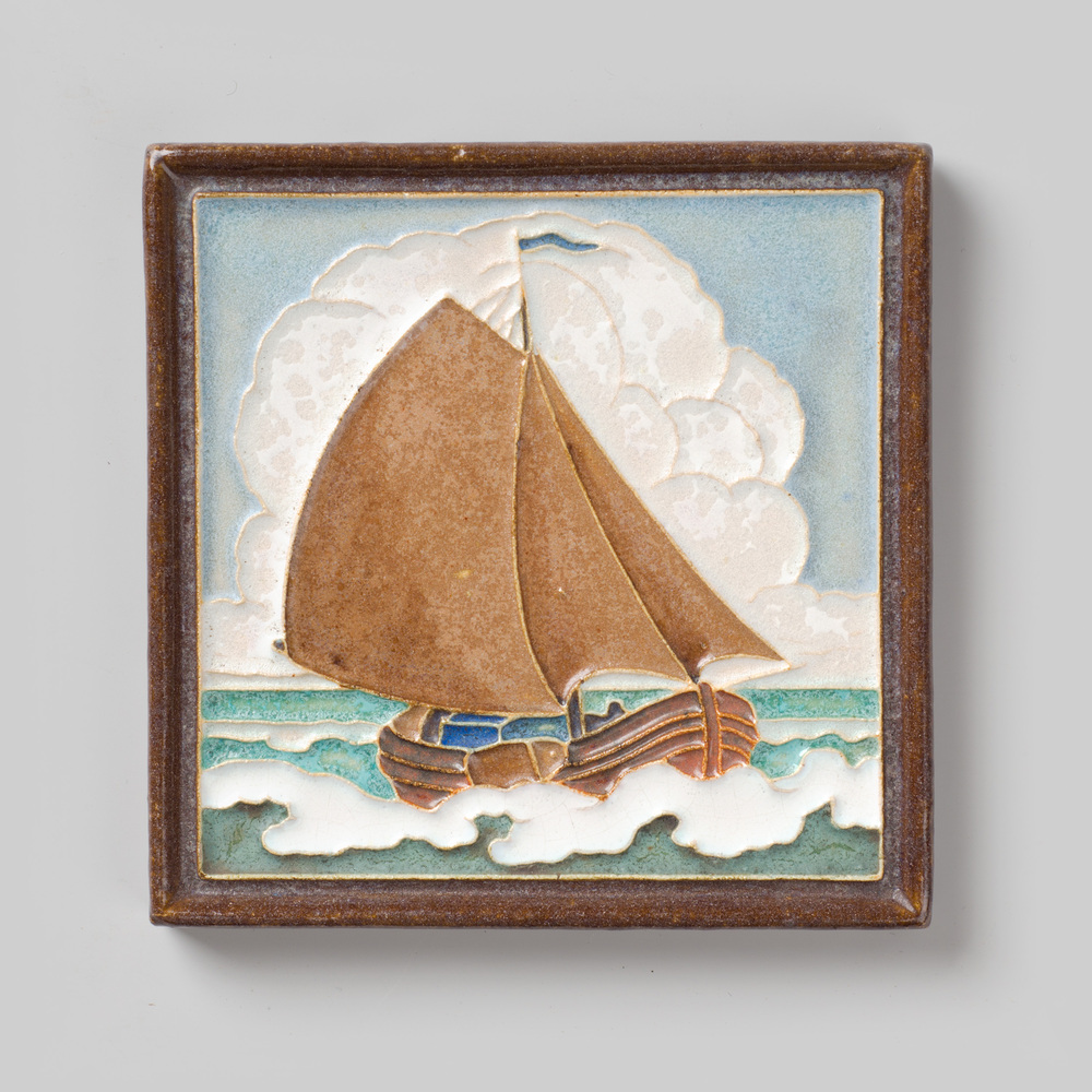 Tegel in cloisonné-techniek, met voorstelling: Tjalk...