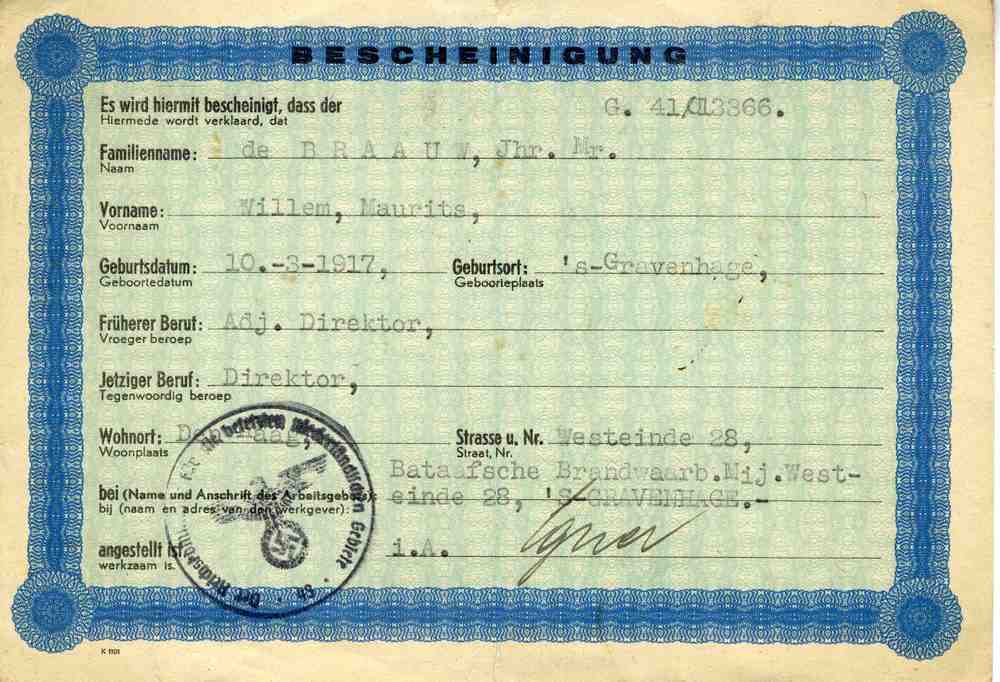 bewijs op naam van Jhr. mr. de Brauw als directeur w...
