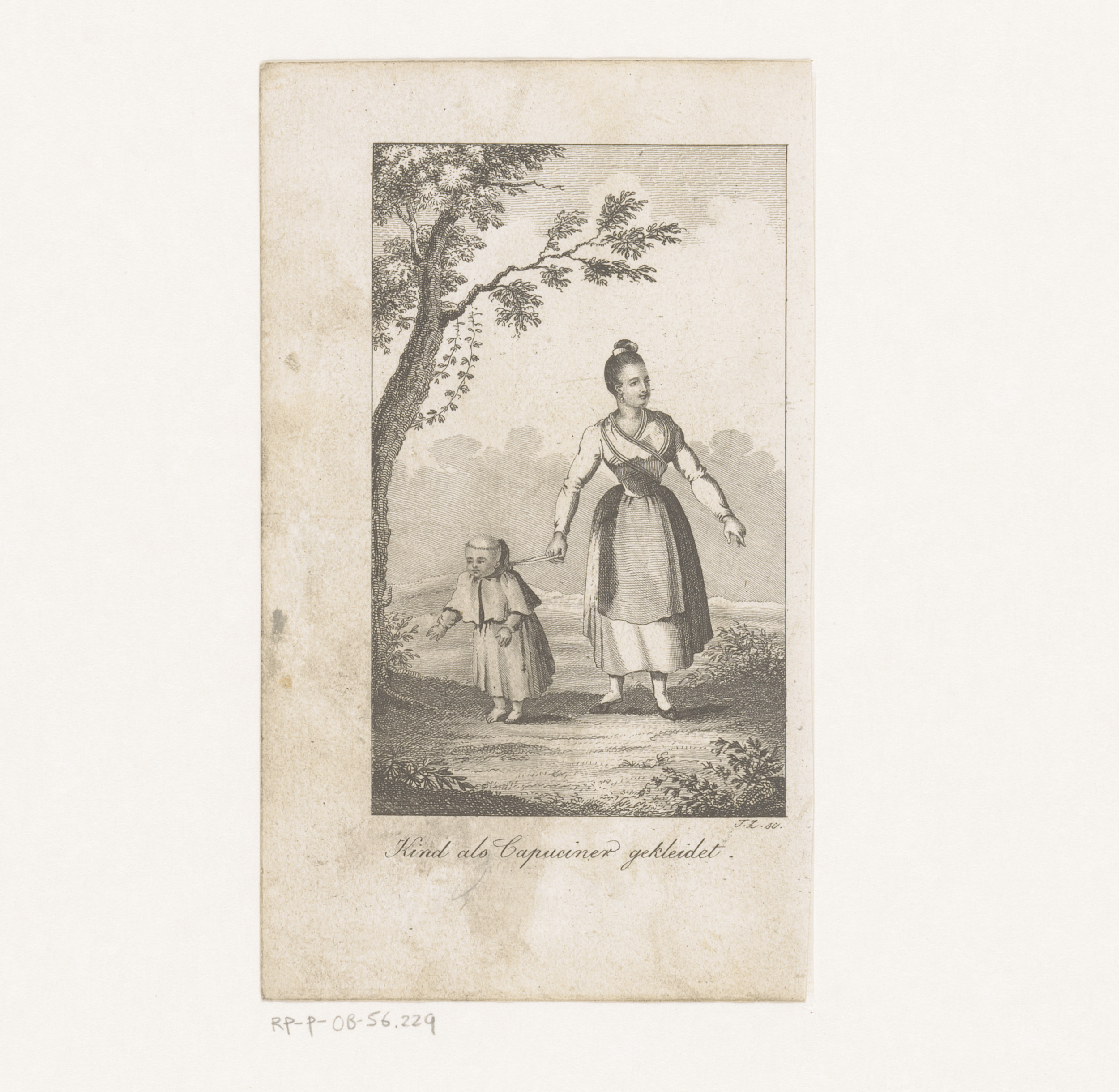 Vrouw met een kind gekleed als kapucijner monnik