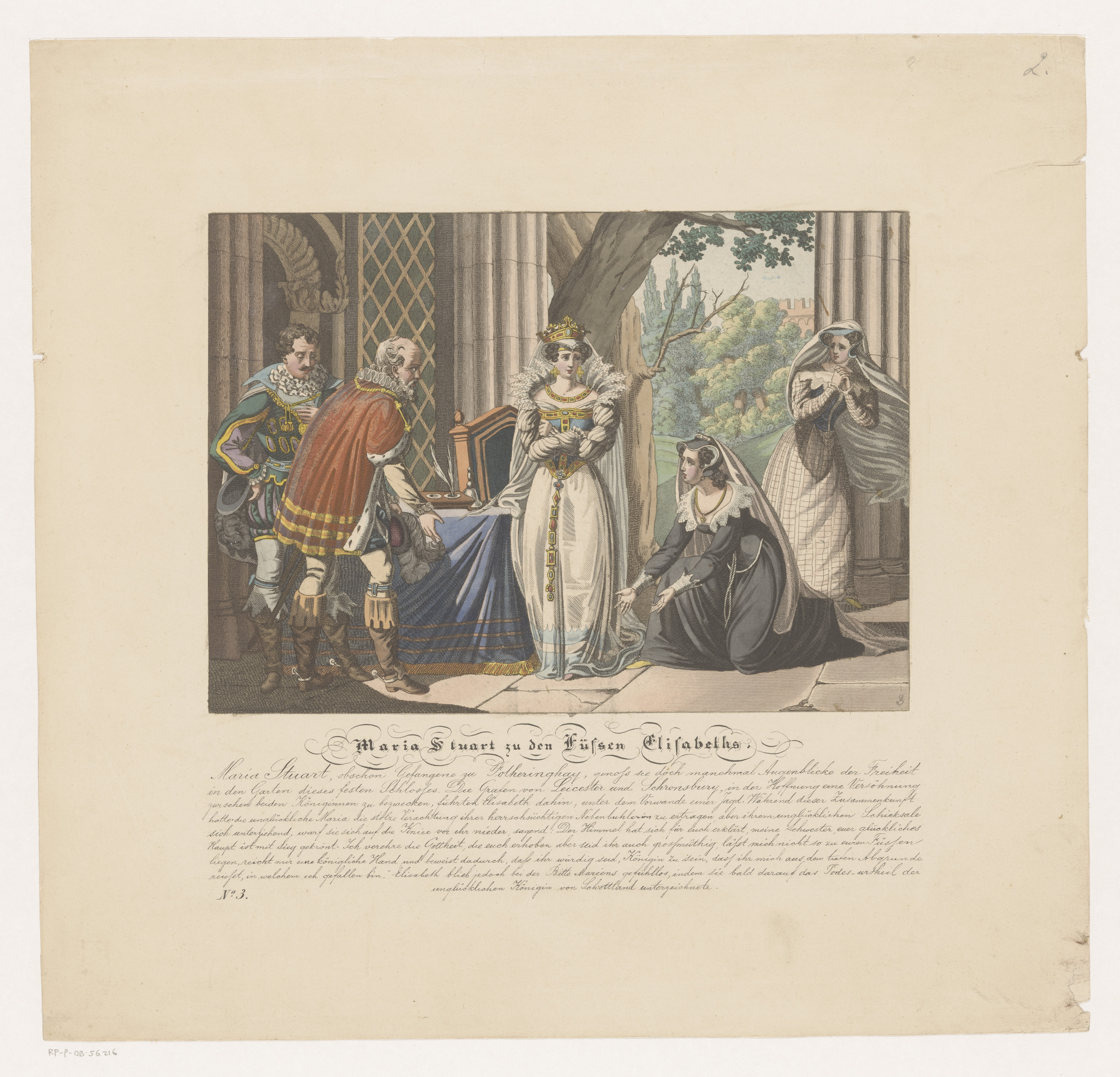 Maria I Stuart geknield voor koningin Elizabeth