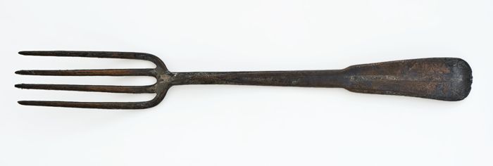 Koperen vork met vier lange tanden en platte steel m...