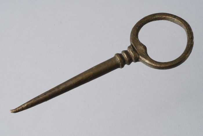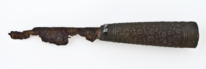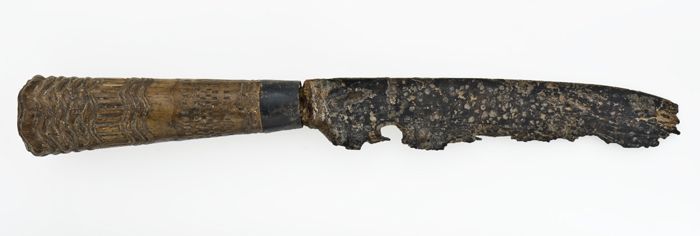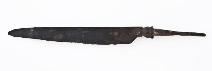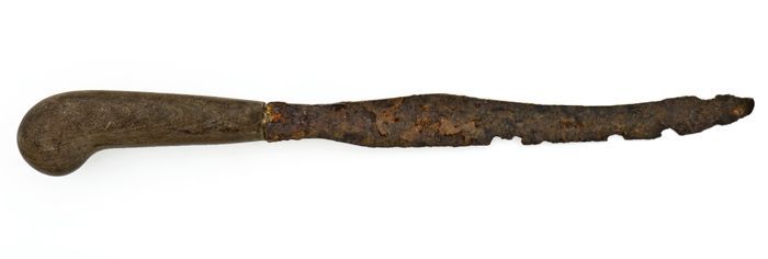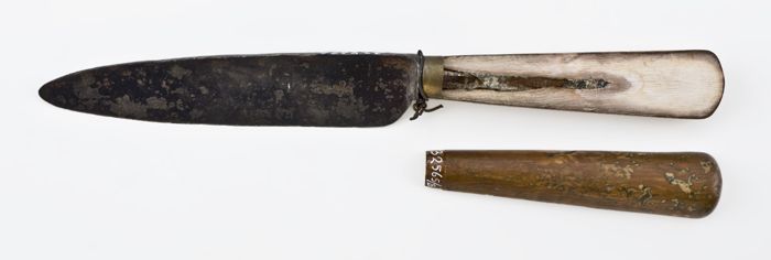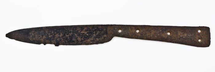 IJzeren mes met langwerpig, puntig lemmet en plaatangel
