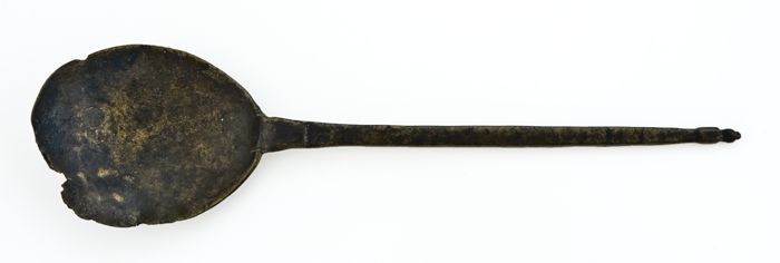 Koperen lepel met vijgvormige bak, op overgang naar ...