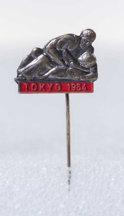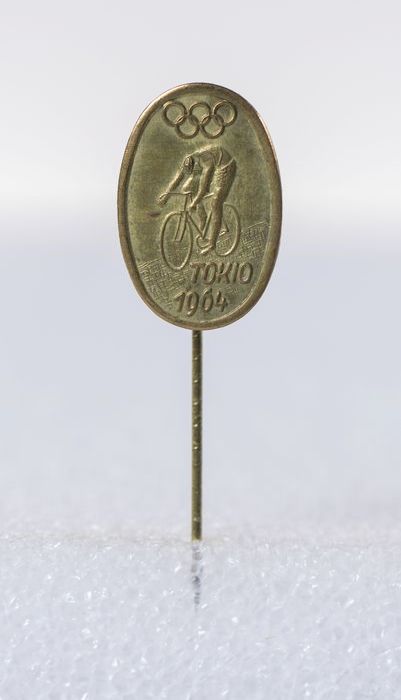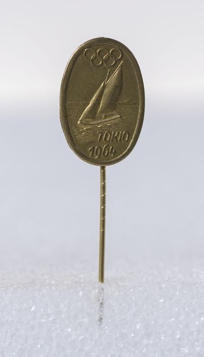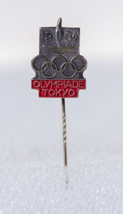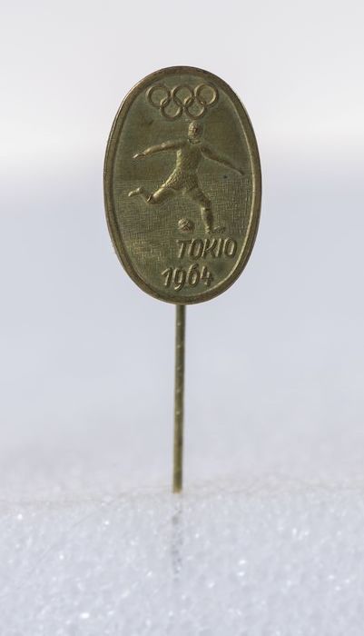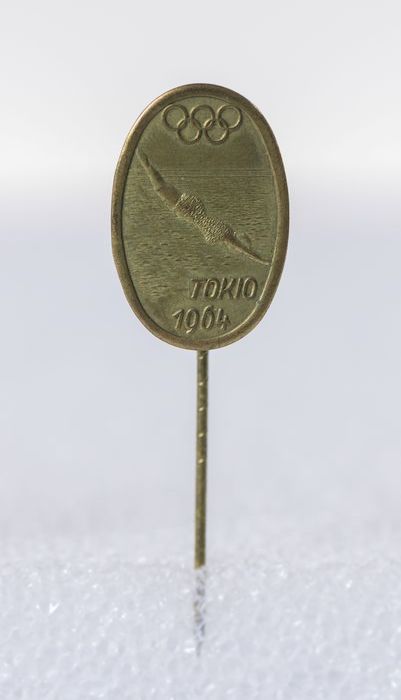 Goudkleurig ovale reclamespeld, met "Tokio, 1964", o...