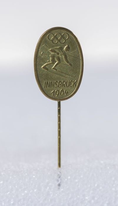 Goudkleurig ovale reclamespeld, met "Innsbruck, 1964...