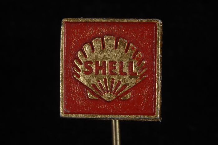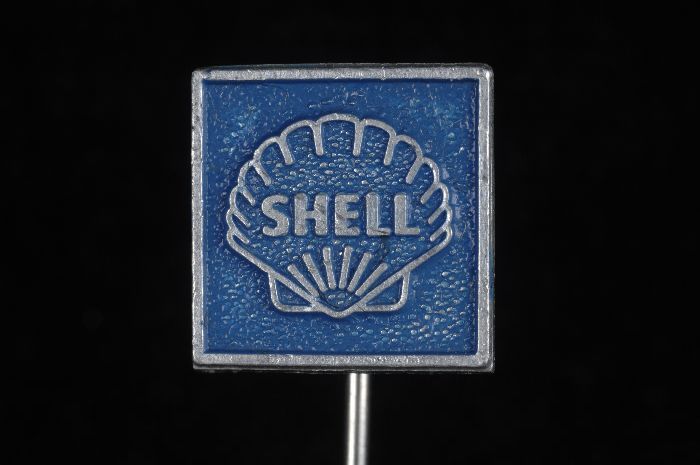 Blauw en zilverkleurig vierkante reclamespeld, "Shell"