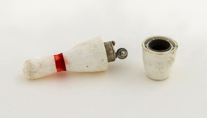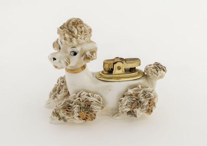 Messing benzineaansteker op wit porseleinen voetstuk...