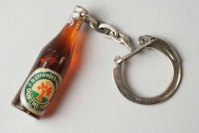 Sleutelhanger, 'bier', bruin transparant plastic min...