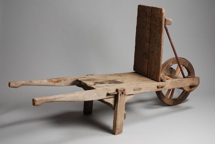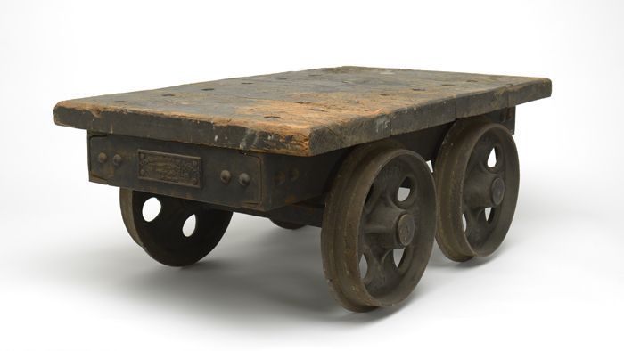 Kolenwagen, dikke houten vlonder op vier kleine ijze...