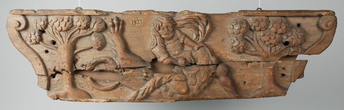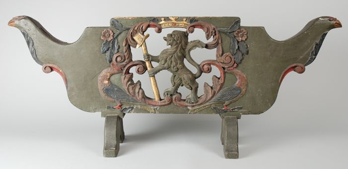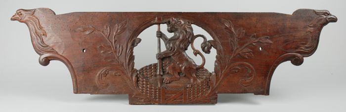 Ornament van wagen, gesneden leeuw met speer en hoed