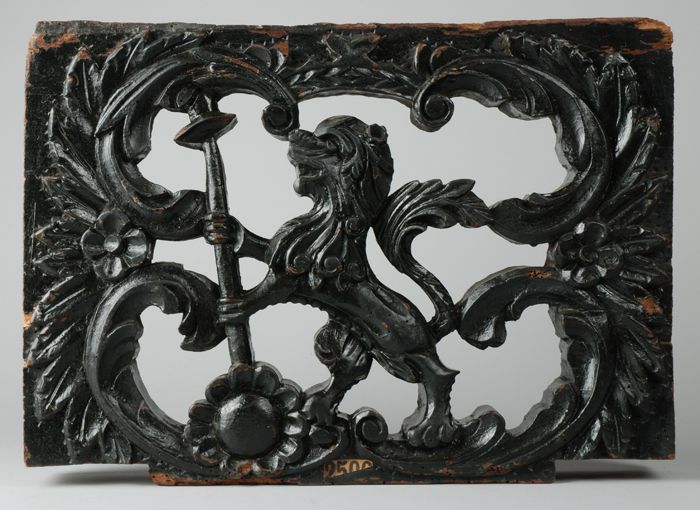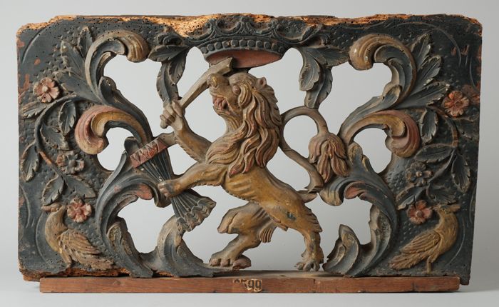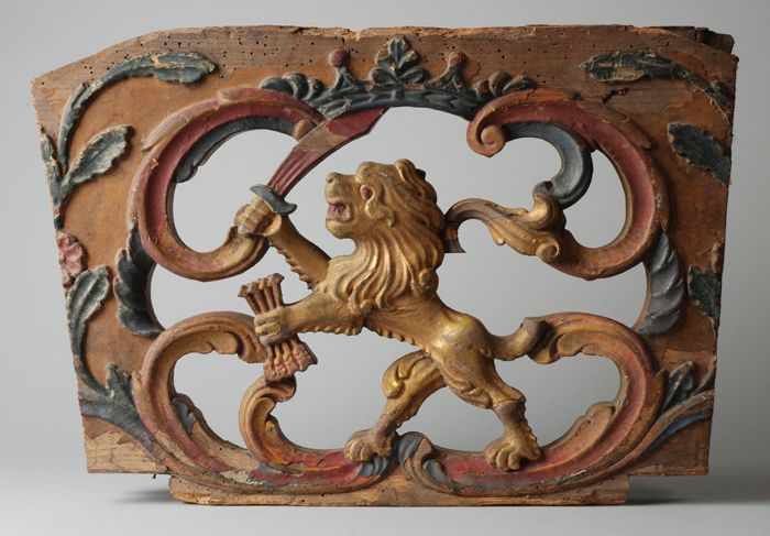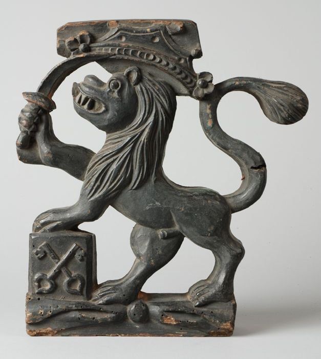 Gesneden houten leeuw met zwaard en stadswapen van L...