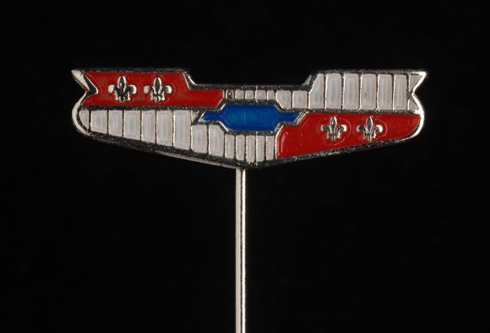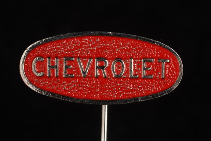 Ovaal rood reclamespeldje, met in zilver "Chevrolet"