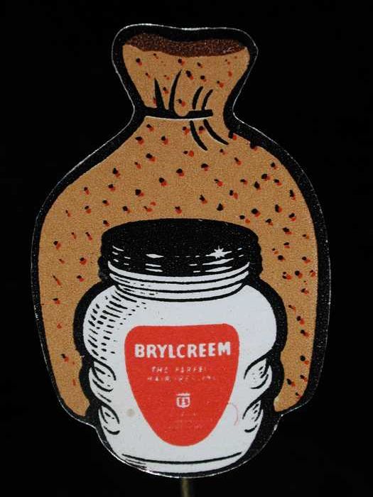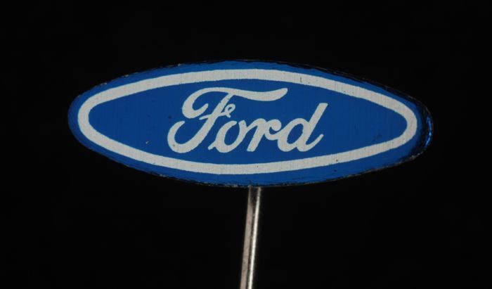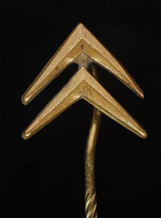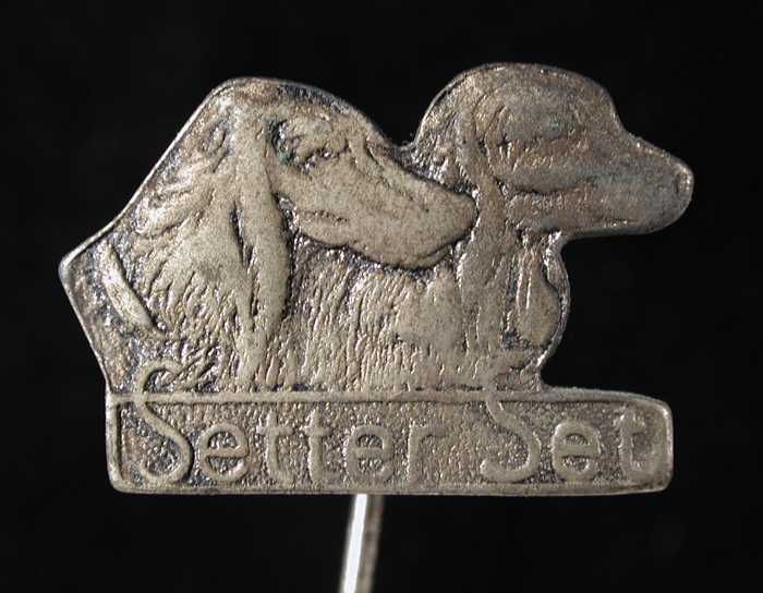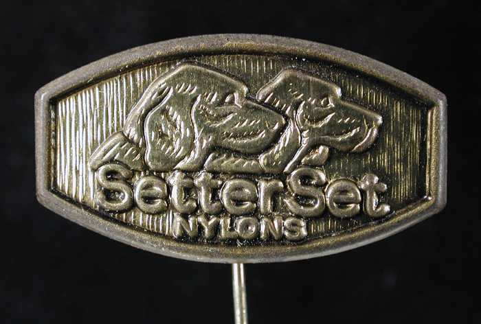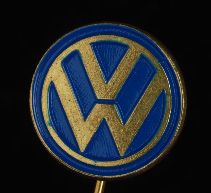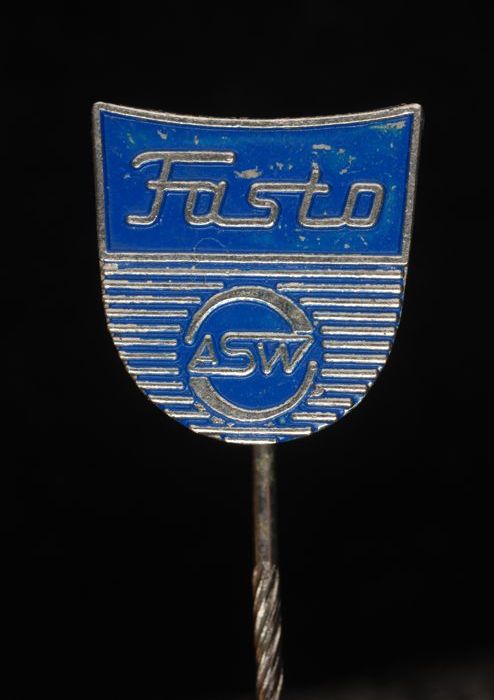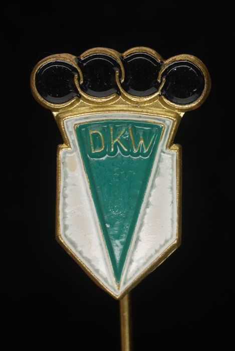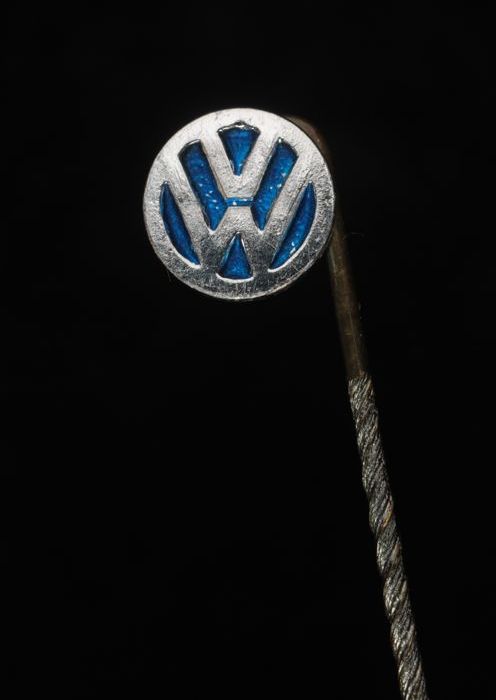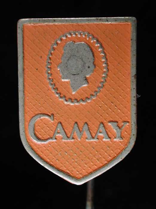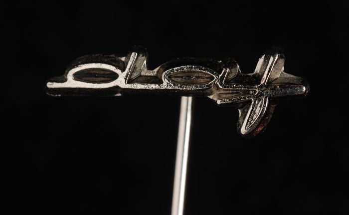 Zilverkleurige reclamespeld, met in schrijfletter "daf"