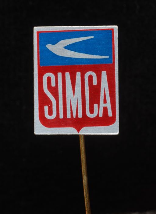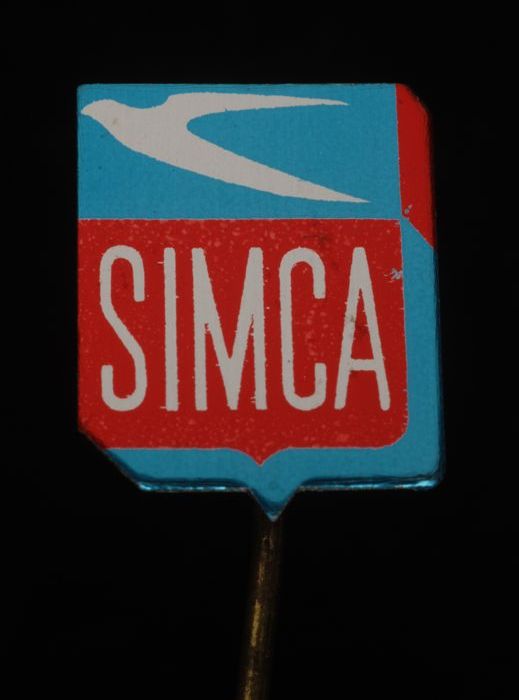Rechthoekige blauw en rode reclamespeld, "Simca"