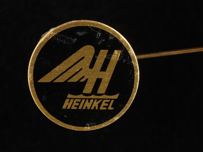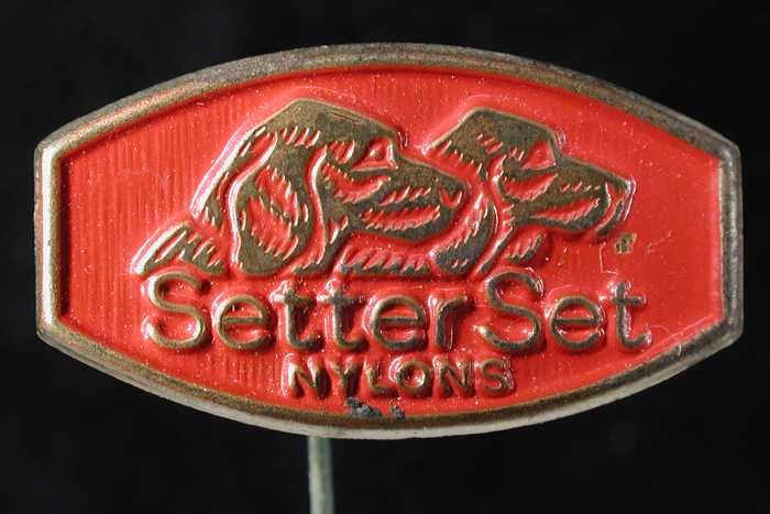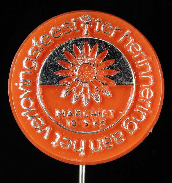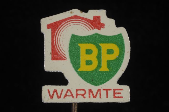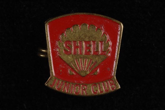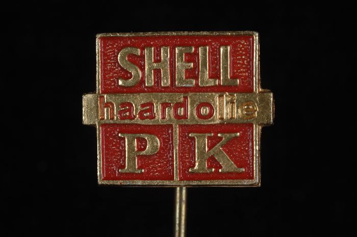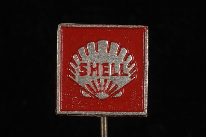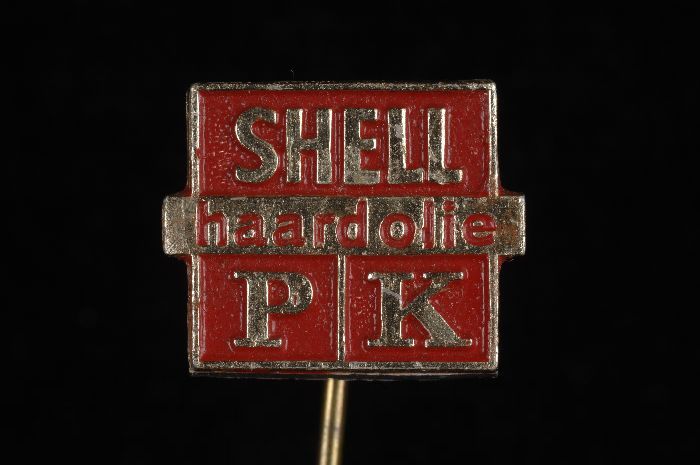 Rood en goudkleurig reclamespeldje, "Shell, haardoli...