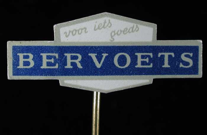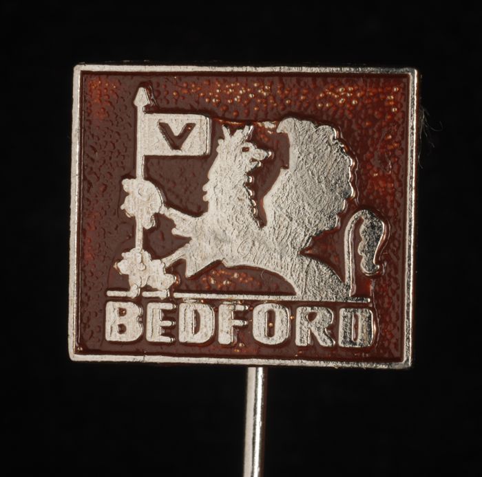 Rood en zilverkleurig vierkant reclamespeldje, "Bedf...