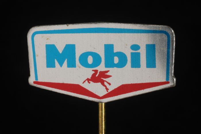 Rood en blauw langwerpig reclamespeldje, "Mobil"