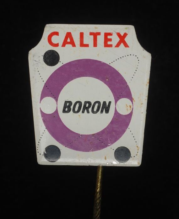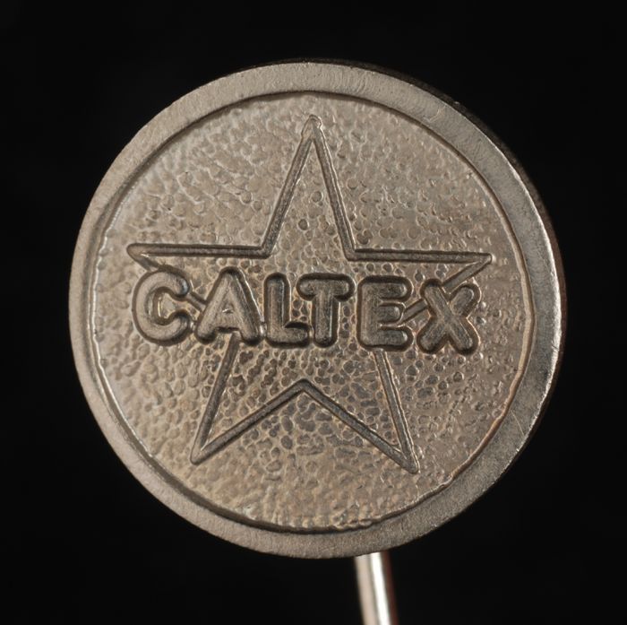 Rood en paars schildvormig reclamespeldje, "Caltex, ...