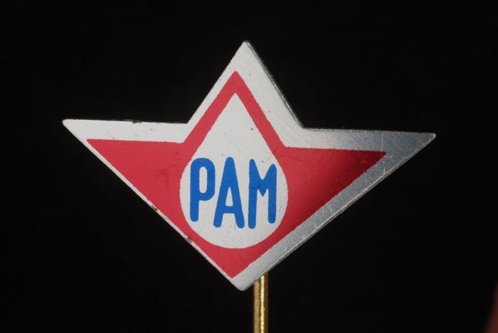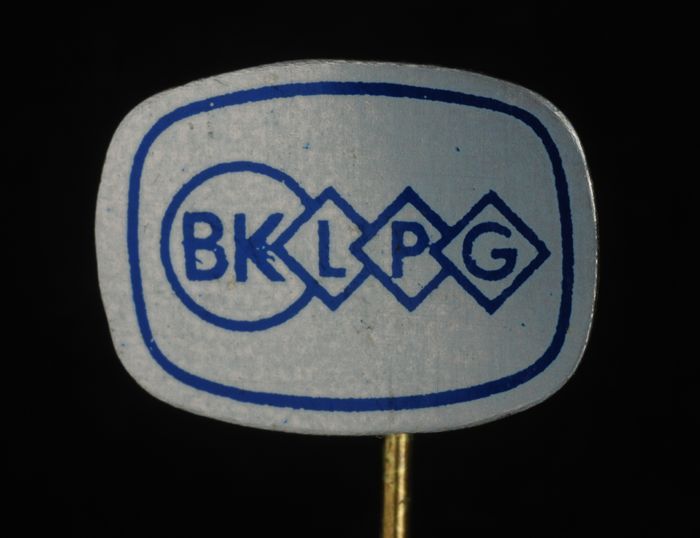 Blauw en zilverkleurig reclamespeldje "BK LPG"