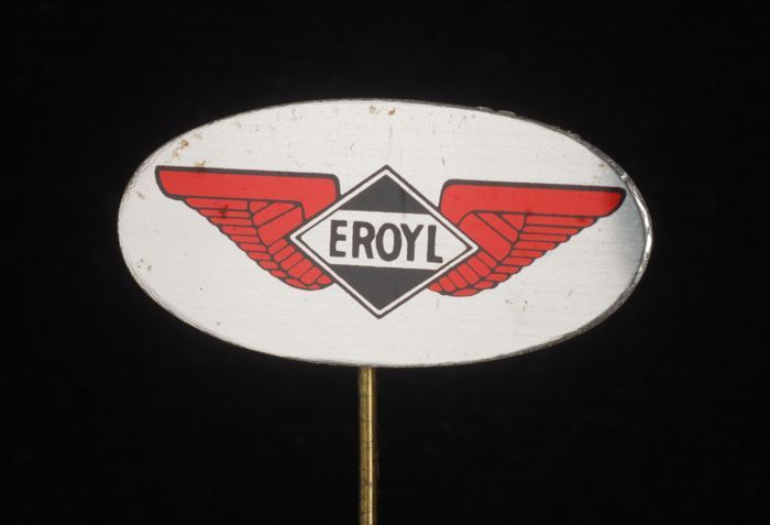 Zwart, rood en zilverkleurig ovaal "Eroyl" reclamesp...