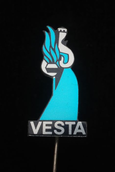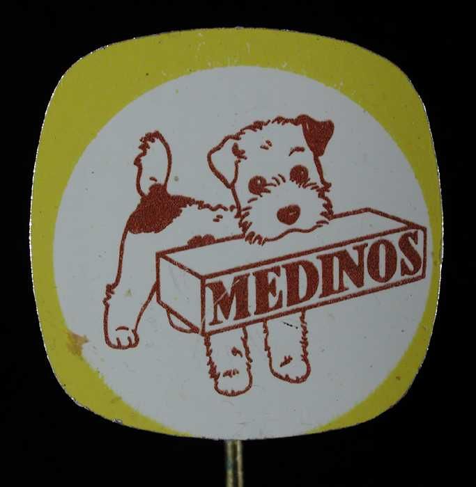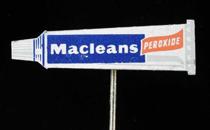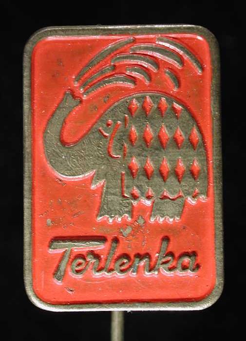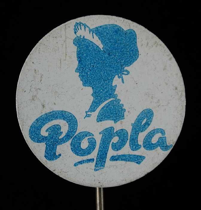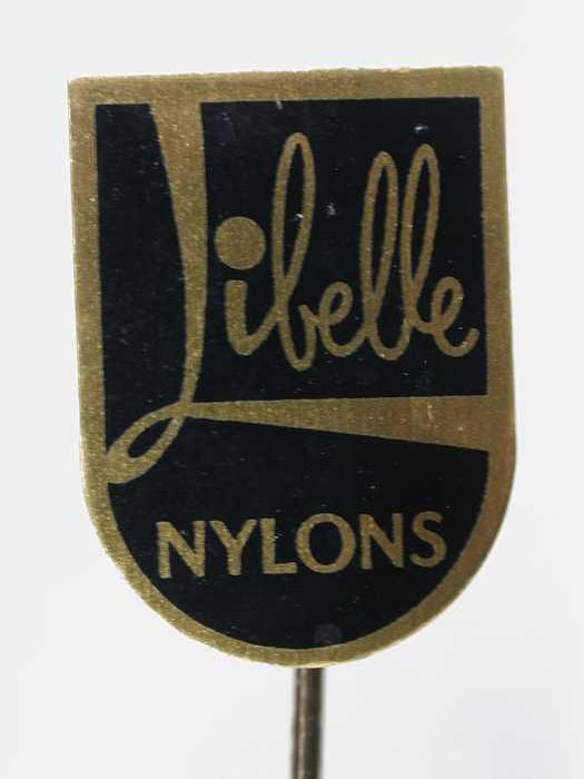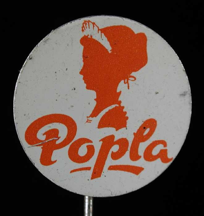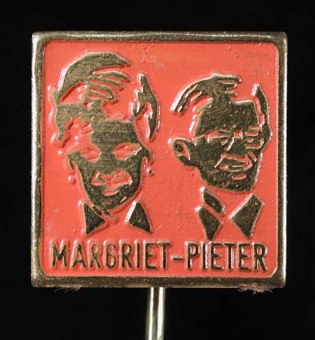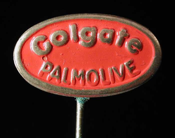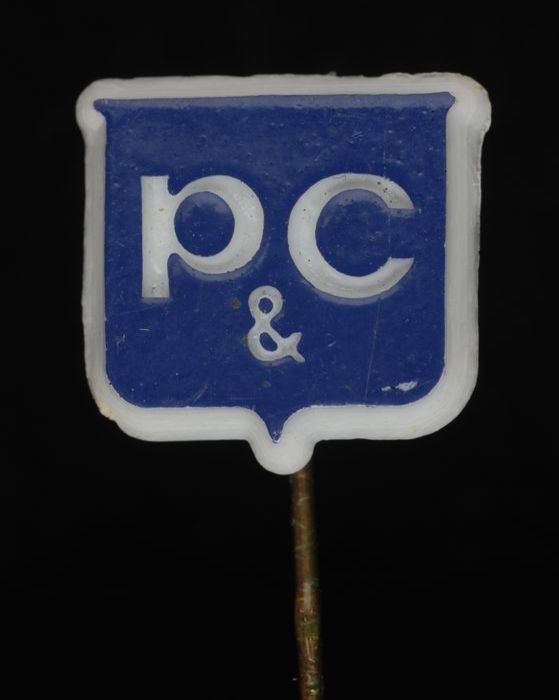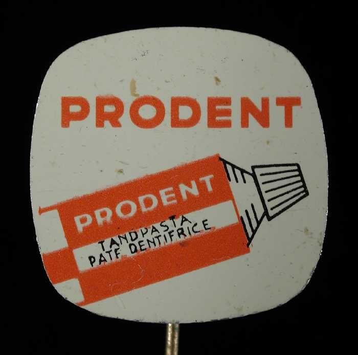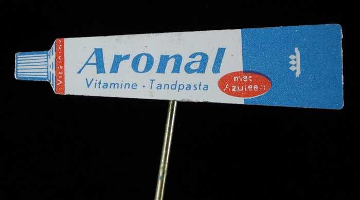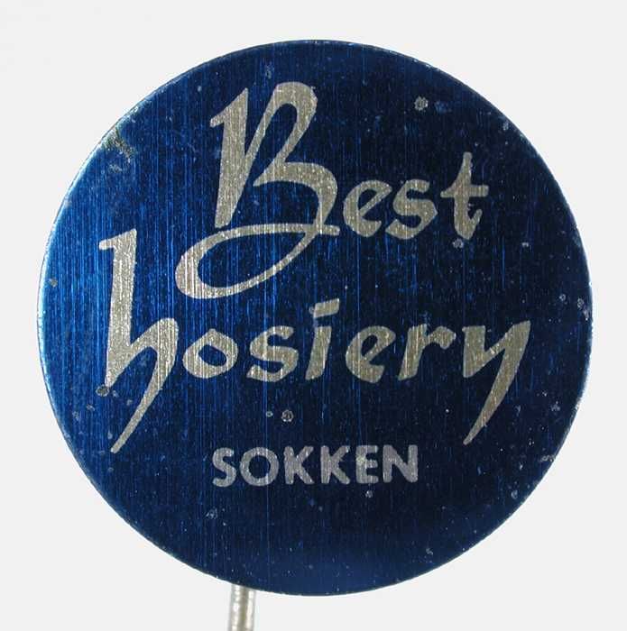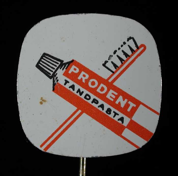 Rood en blauw langwerpig reclamespeldje, met embleem...