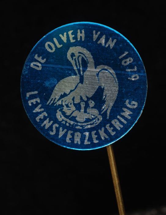 Blauw en zilverkleurig rond reclamespeldje, "De Olve...