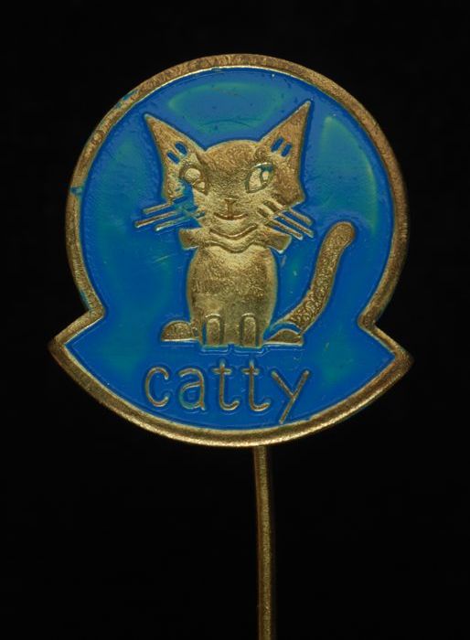 Blauw en goudkleurig reclamespeldje, "Catty", met poes