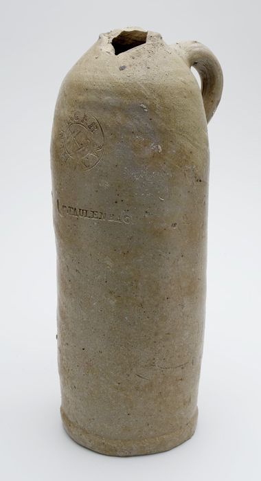 Steengoed cilindrische mineraalwaterkruik met oor, g...