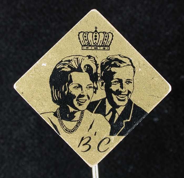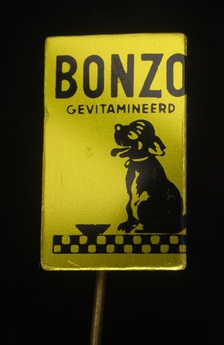 Zwart en goudkleurig rechthoekig reclamespeldje, "Bo...