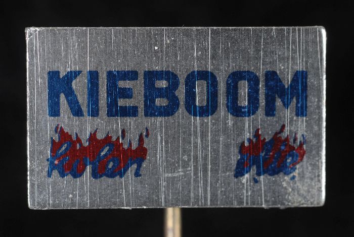 Blauw en rood rechthoekige reclamespeld, "Kieboom, k...