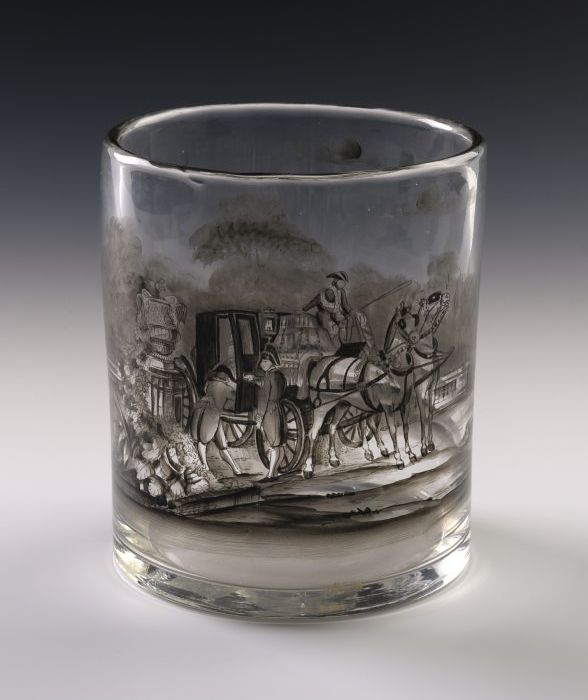 Dikwandige beker beschilderd (Schwartzlot) met rijtu...