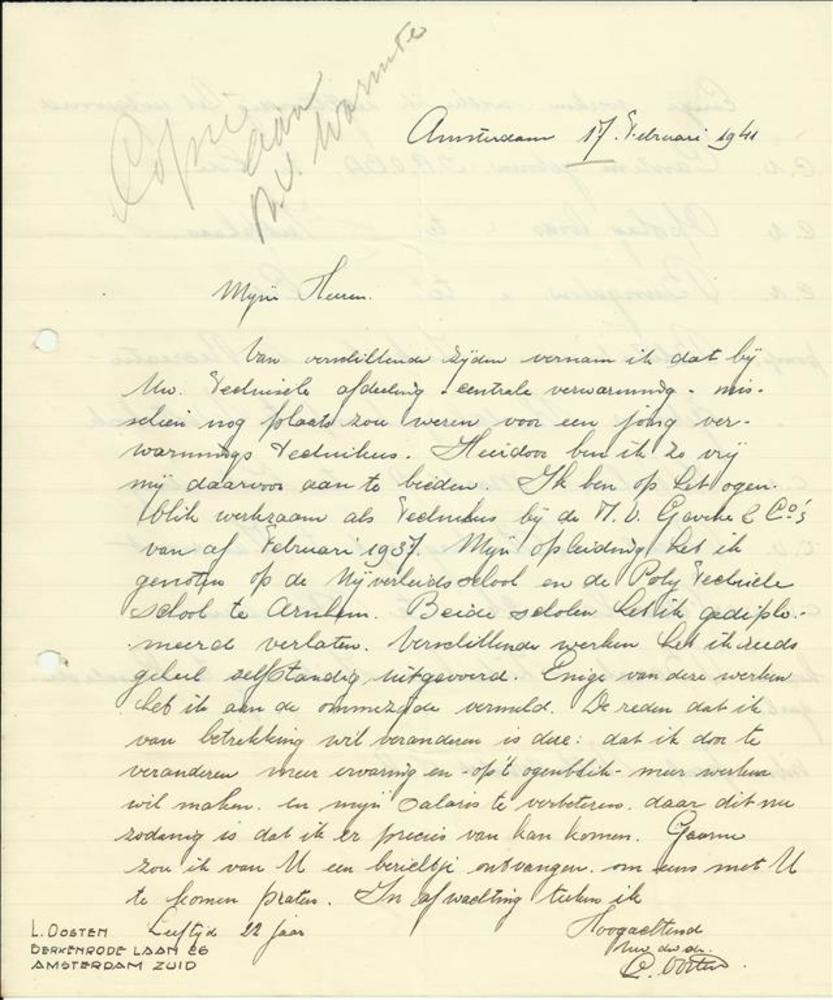 Sollicitatiebrief van dhr Oosten te Amsterdam aan de...