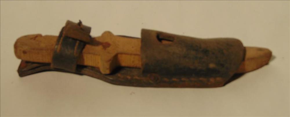 dolkhouder van zwart leer met een houten speelgoed mes